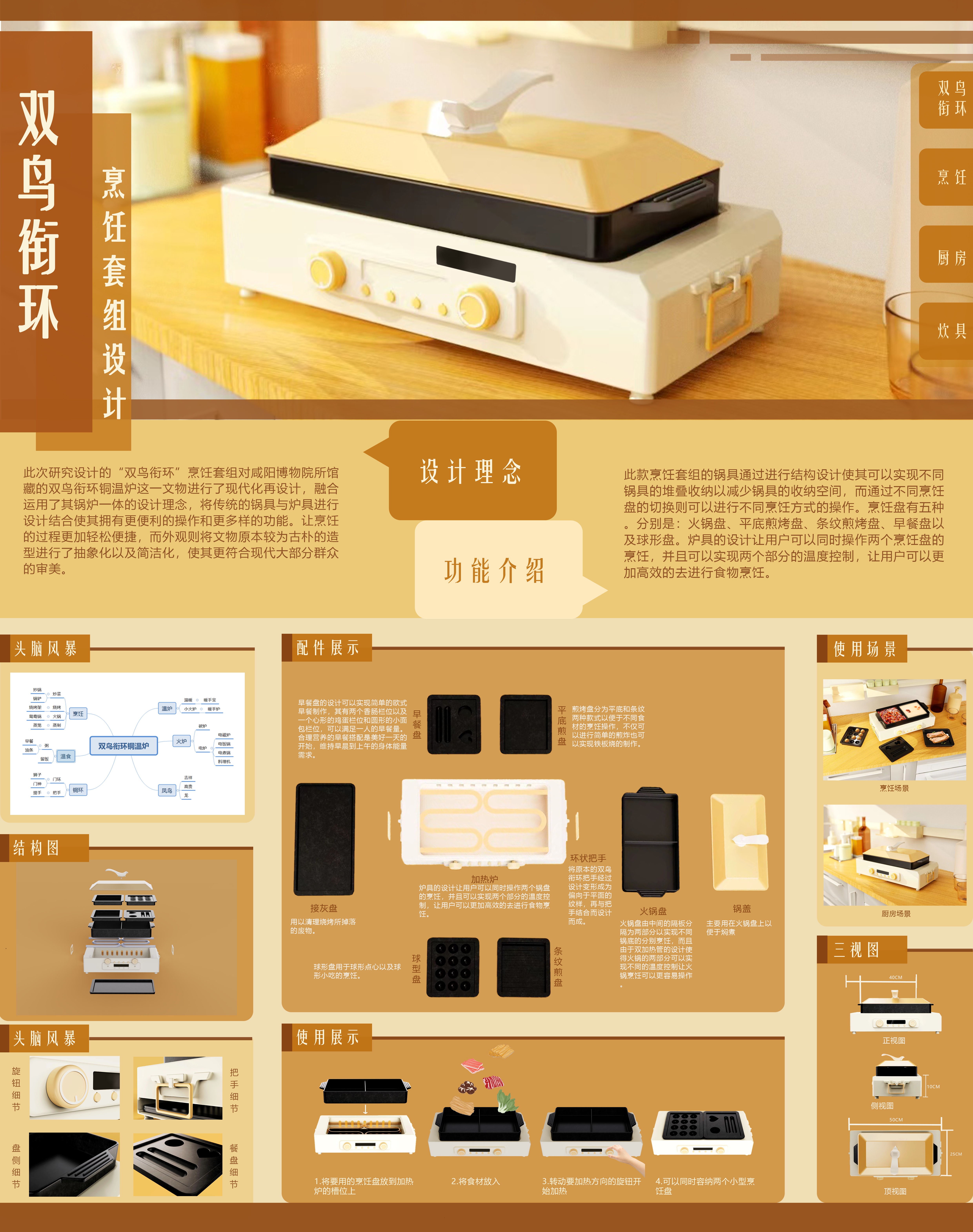 此次设计的“双鸟衔环”烹饪套组,是对咸阳博物院所馆藏的双鸟衔环铜温炉这一文物进行了现代化再设计,融合运用了其锅炉一体的设计理念,将传统的锅具与炉具进行设计结合使其拥有更便利的操作和更多样的功能。让烹饪的过程更加轻松便捷,而外观则将文物原本较为古朴的造型进行了抽象化以及简洁化,使其更符合现代大部分群众的审美。
