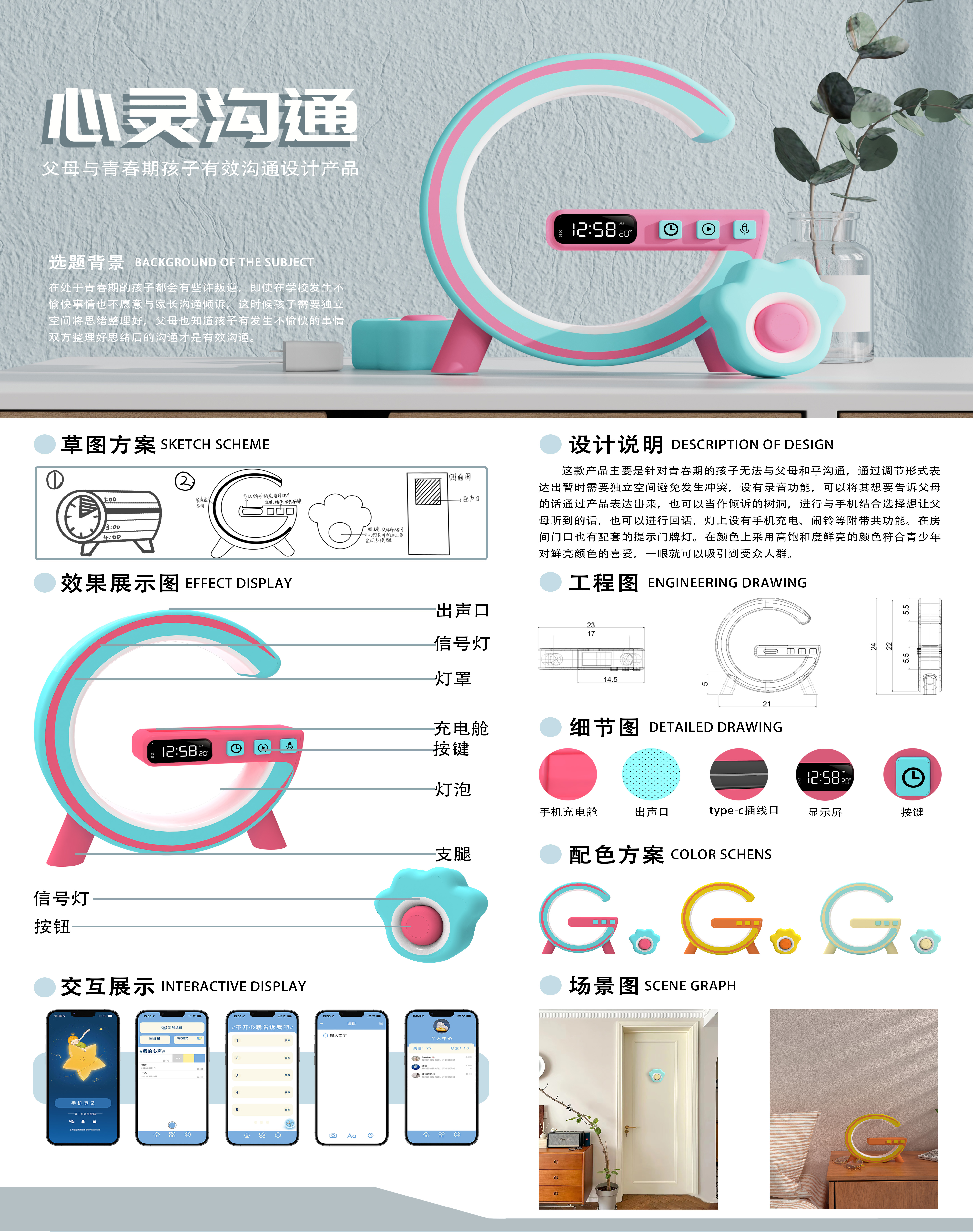 这款产品主要是针对青春期的孩子无法与父母和平沟通,通过调节形式表达出暂时需要独立空间避免发生冲突,设有录音功能,可以将其想要告诉父母 的话通过产品表达出来,也可以当作倾诉的树洞,进行与手机结合选择想让父母听到的话,也可以进行回话,灯上设有手机充电、闹铃等附带共功能。在房 间门口也有配套的提示门牌灯。在颜色上采用高饱和度鲜亮的颜色符合青少年对鲜亮颜色的喜爱,一眼就可以吸引到受众人群。
