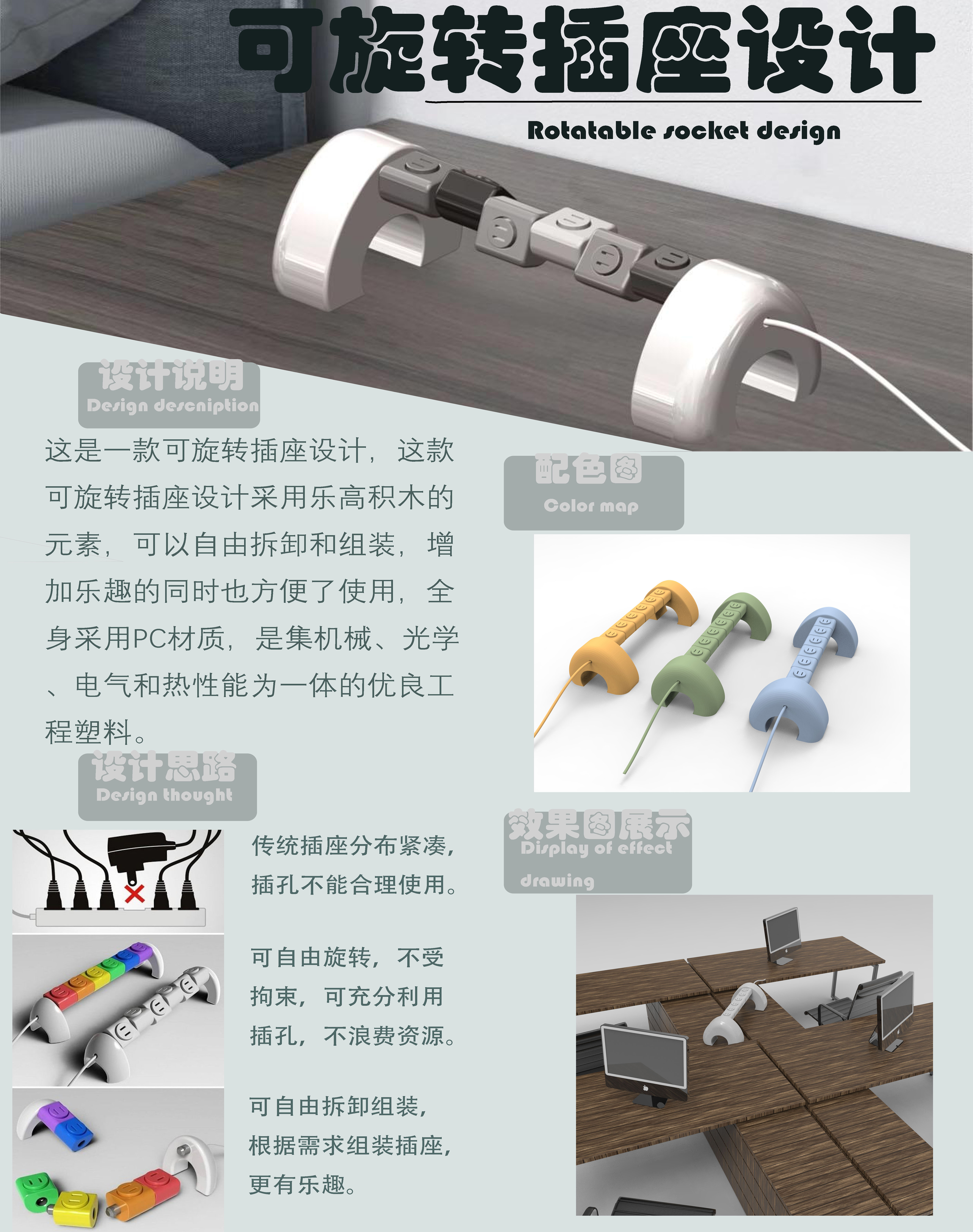 这是一款可旋转插座设计,这款可旋转插座设计采用乐高积木的Color map元素,可以自由拆卸和组装,增加乐趣的同时也方便了使用,全身采用PC材质,是集机械、光学、电气和热性能为一体的优良工程塑料。