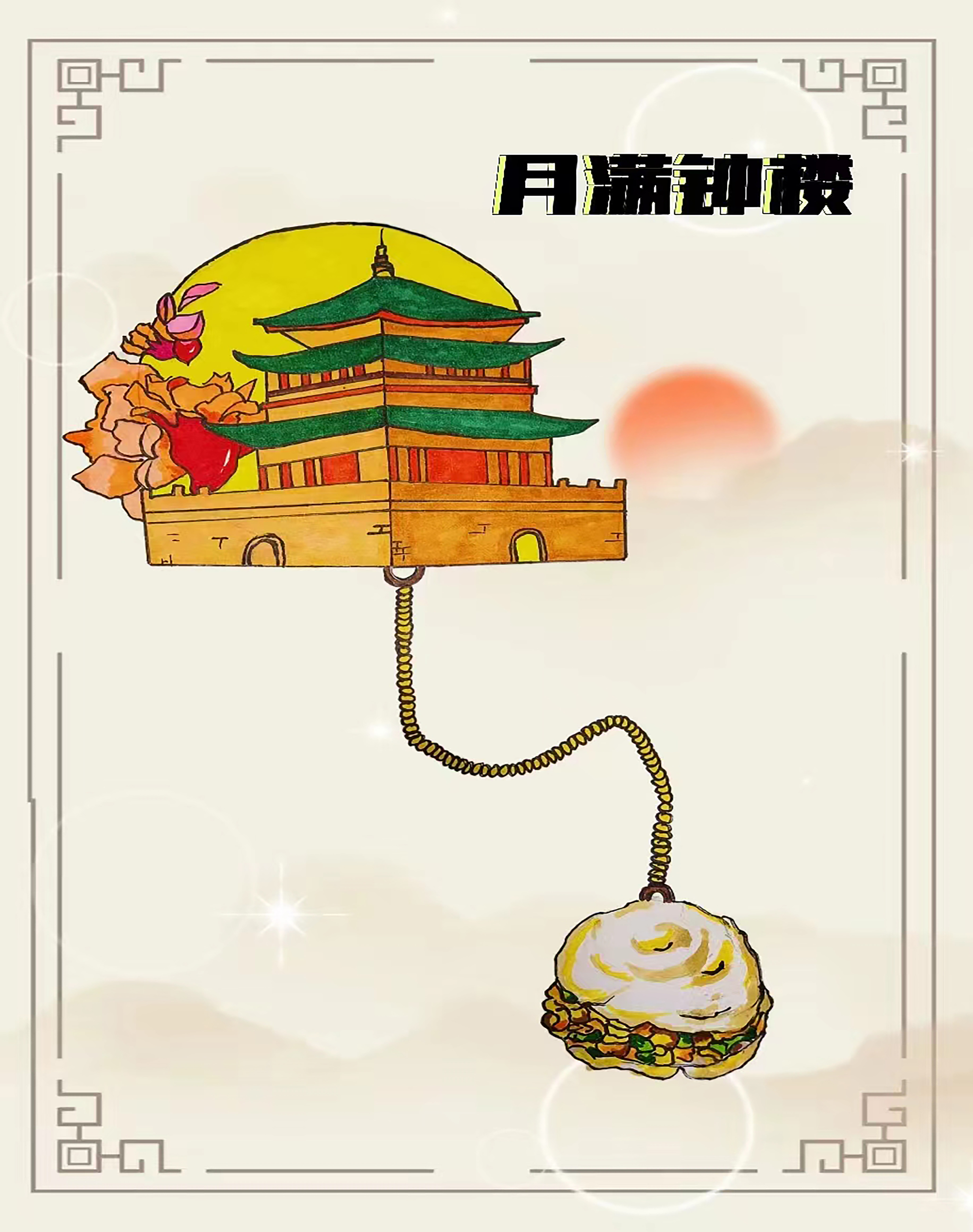 作品为西安极具有特色的地标性建筑钟楼衍生产品-书签。左边加入了西安市花石榴花为点缀,背景是一个圆月,寓意花好月圆人团圆。下方以西安特色美食肉夹馍为吊坠。加入钟楼地标,石榴红和西安特色美食肉夹馍,更突出城市的文化气息。