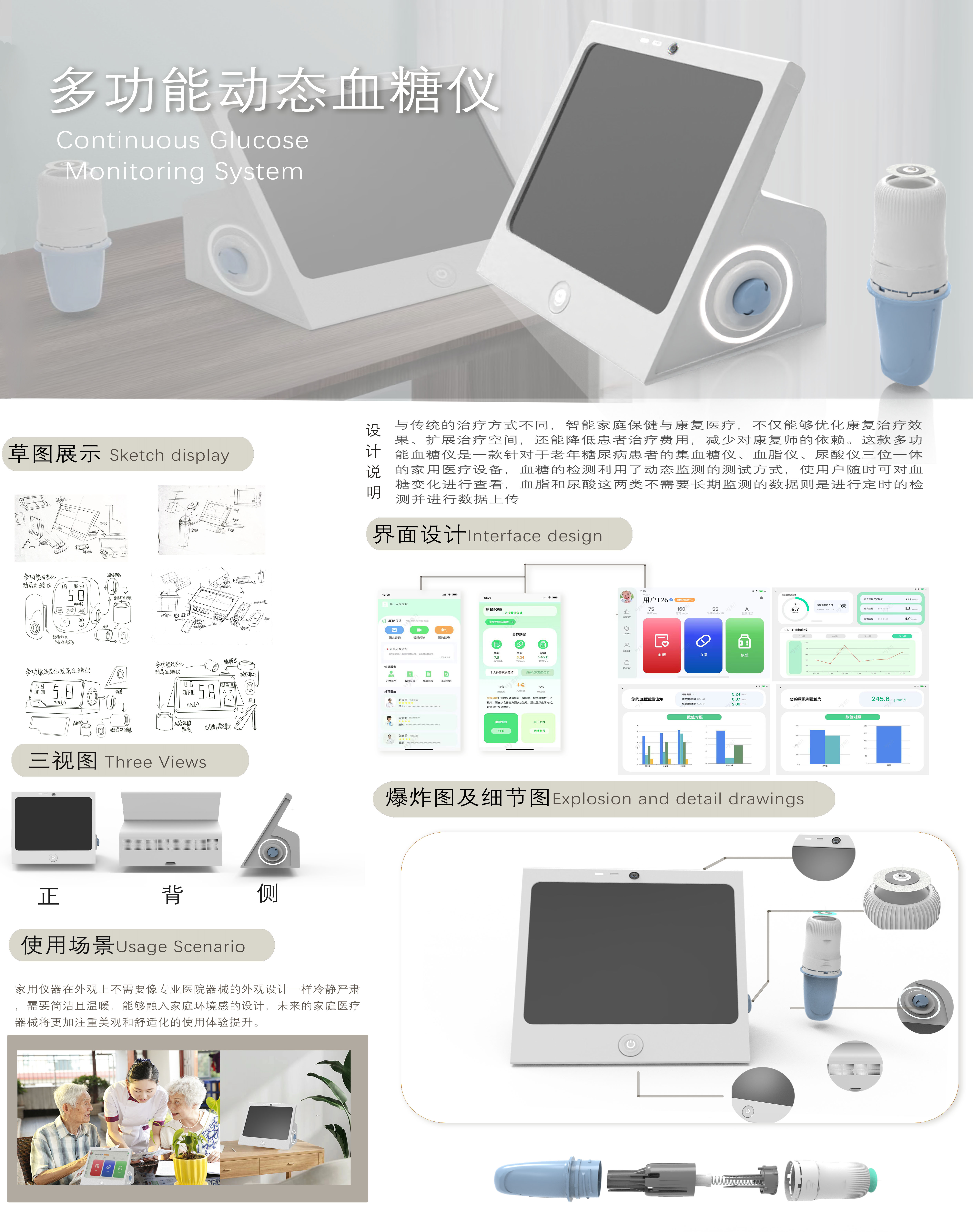 这款多功能血糖仪是一款针对于老年糖尿病患者的集血糖仪、血脂仪、尿酸仪三位一体的家用医疗设备,血糖的检测利用了动态监测的测试方式,使用户随时可对血糖变化进行查看,血脂和尿酸这两类不需要长期监测的数据则是进行定时的检测并进行数据上传;这款多功能血糖仪是为了使更多患有糖尿病的老年人即使足不出户也能对自身的身体健康有具象化的概念,帮助更多老年糖尿病患者缓解或预防病情的恶化,更加注重自身身体健康。