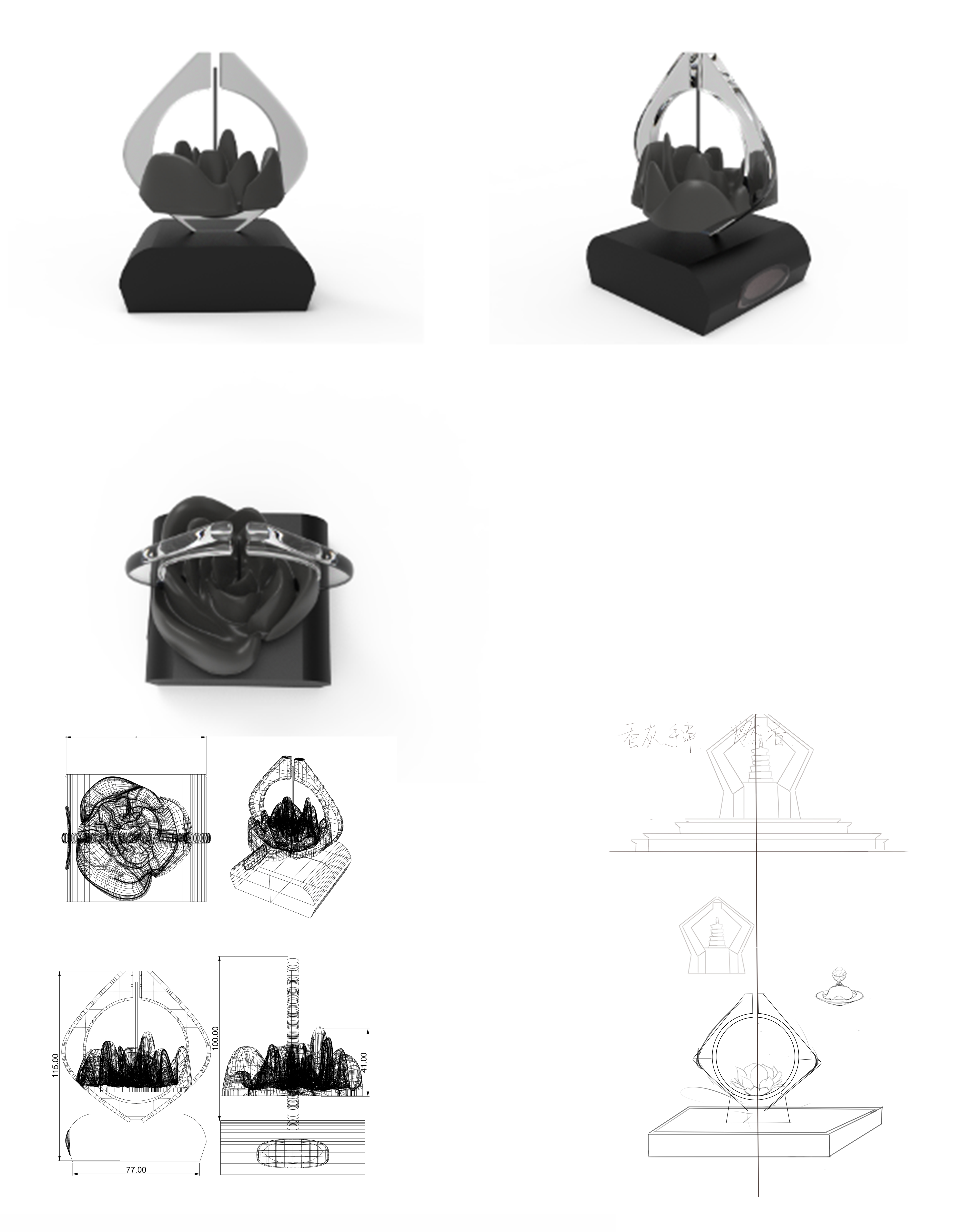 此设计借用法门寺中合十舍利塔的造型,结合佛手莲心进行文化创意设计。莲花中心是空的与底座空心连接,可积攒香灰,与法门寺中的香灰手串进行连接。双手合十,手握圆,园中有莲心,是结合拜佛时姿势以及祈愿进行创造,合十祈愿中含有万物,圆代表万物。