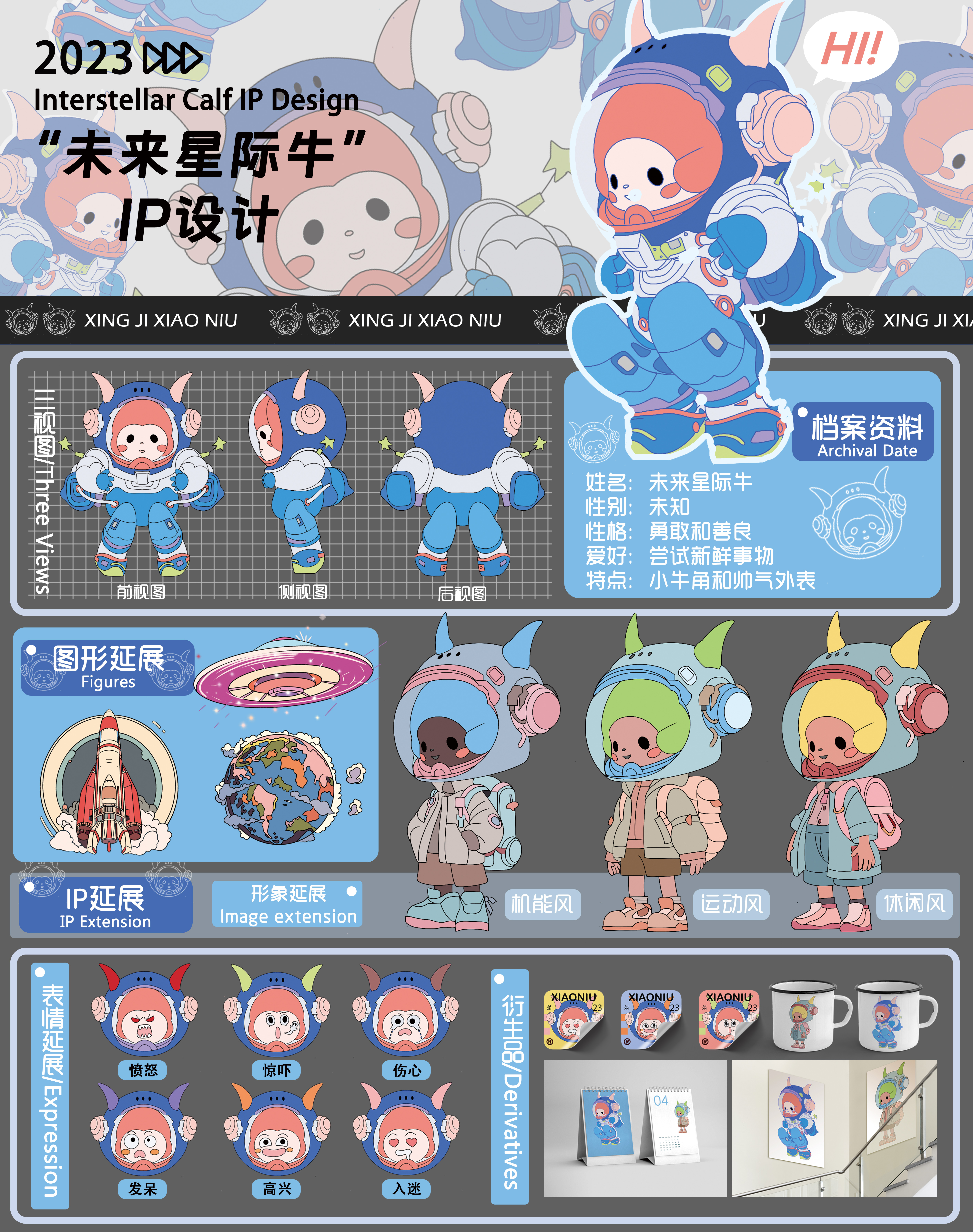 “未来星际牛”IP形象以宇航员和小牛作为原型进行设计,宇航员代表着勇于冒险和敢于创新的未来精神,小牛代表着迎难而上和永不服输的顽强精神。以蓝色为主,形象可爱更加容易产生亲近感。形象延展中,以机能风、运动风、休闲风为主题进行服装搭配。表情包延展中,以入迷 、发呆、伤心等不同情绪进行绘制。图形延展中,设计星球 、UFO和火箭 。在衍生品中以饮料、水杯和贴纸等形式连接,能够更轻松地融入现实生活之中。