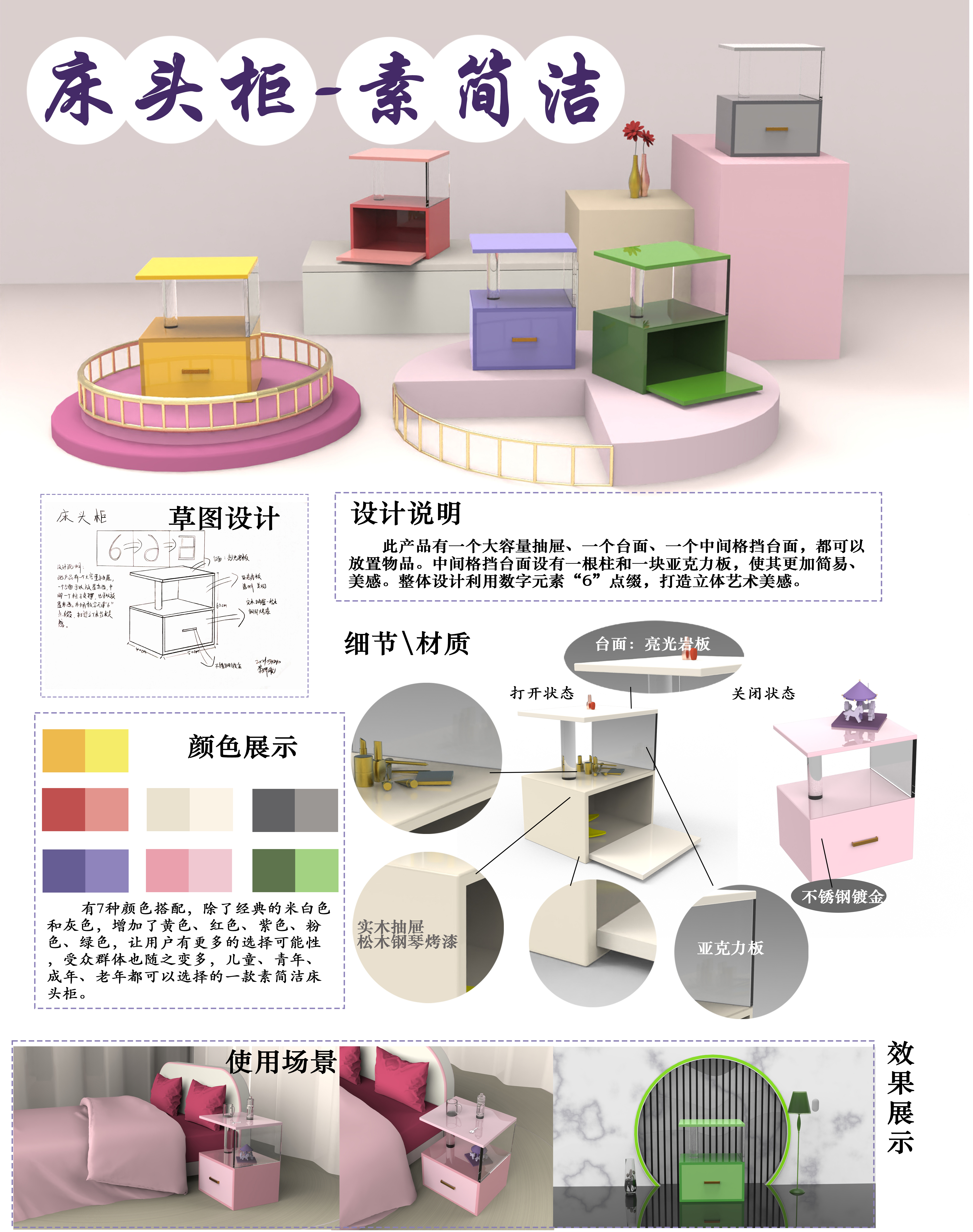 此产品有一个大容量抽屉、一个台面、一个中间格挡台面,都可以放置物品。中间格挡台面设有一根柱和一块亚克力板,使其更加简易、美感。整体设计利用数字元素“6”点缀,打造立体艺术美感。富有创意感。