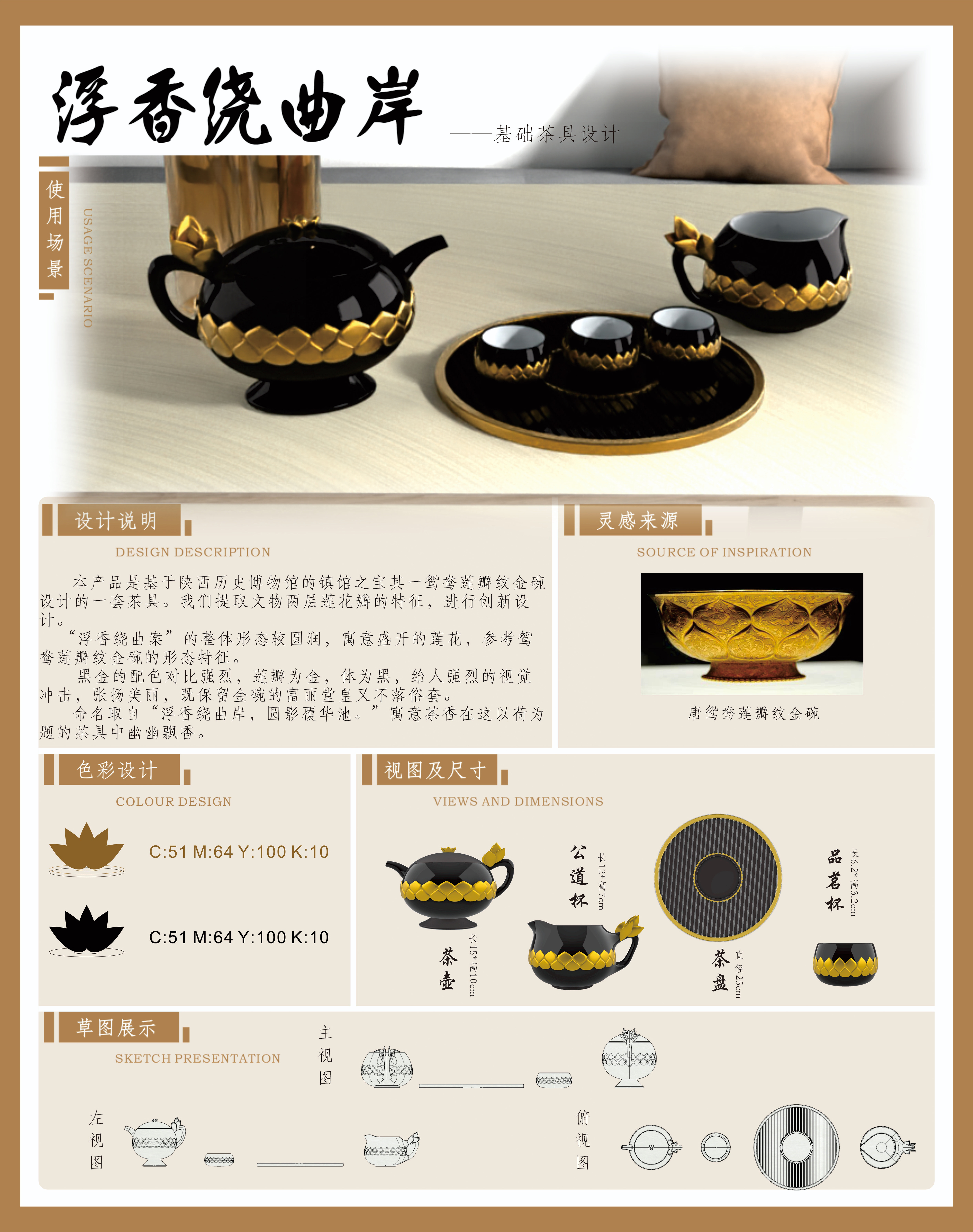 本产品是基于陕西历史博物馆的镇馆之宝其一鸳鸯莲瓣纹金碗设计的一套茶具。我们提取文物两层莲花瓣的特征,进行创新设计。 “浮香绕曲案”的整体形态较圆润,寓意盛开的莲花,参考鸳鸯莲瓣纹金碗的形态特征。黑金的配色对比强烈,莲瓣为金,体为黑,给人强烈的视觉冲击,张扬美丽,既保留金碗的富丽堂皇又不落俗套。命名取自“浮香绕曲岸,圆影覆华池。”寓意茶香在这以荷为题的茶具中幽幽飘香。