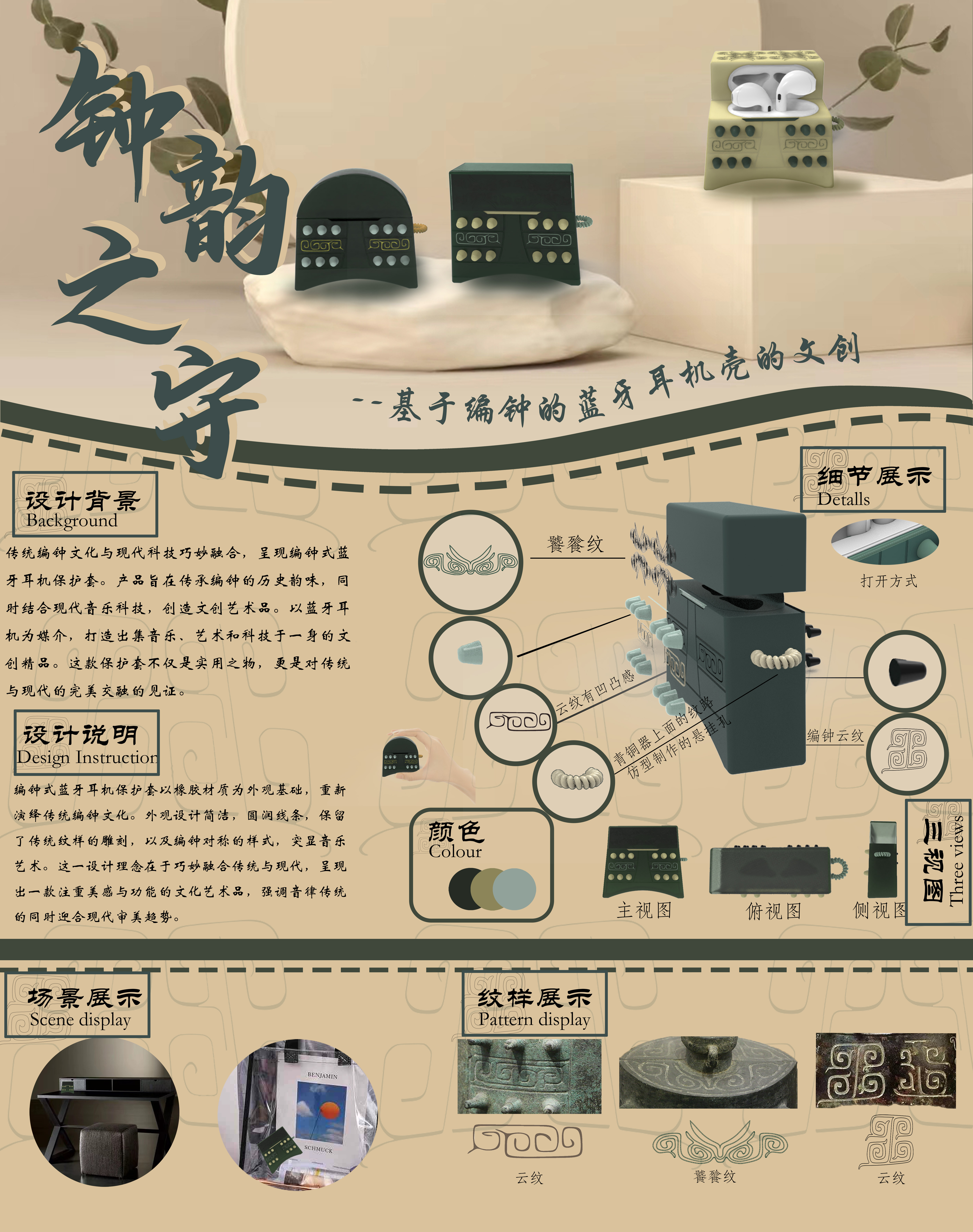 编钟式蓝牙耳机保护套以橡胶材质为外观基础,重新 演绎传统编钟文化。外观设计简洁,圆润线条,保留 了传统纹样的雕刻,以及编钟对称的样式,突显音乐 艺术。这一设计理念在于巧妙融合传统与现代,呈现 出一款注重美感与功能的文化艺术品,强调音律传统 的同时迎合现代审美趋势。