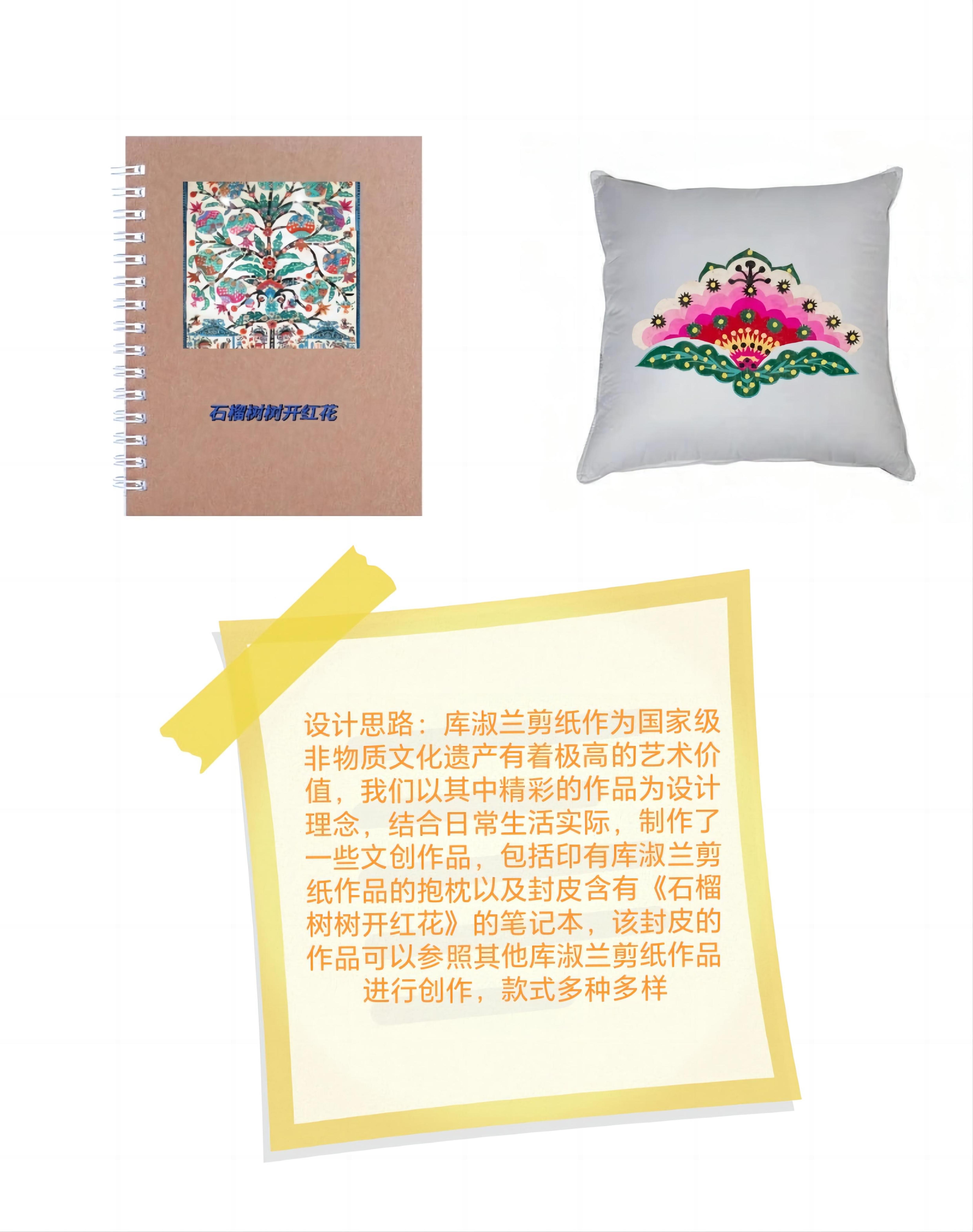 设计思路:库淑兰剪纸作为国家级非物质文化遗产有着极高的艺术价值,我们以其中精彩的作品为设计理念,结合日常生活实际,制作了一些文创作品,包括印有库淑兰剪纸作品的抱枕以及封皮含有《石榴树树开红花》的笔记本,该封皮的作品可以参照其他库淑兰剪纸作品进行创作,款式多种多样