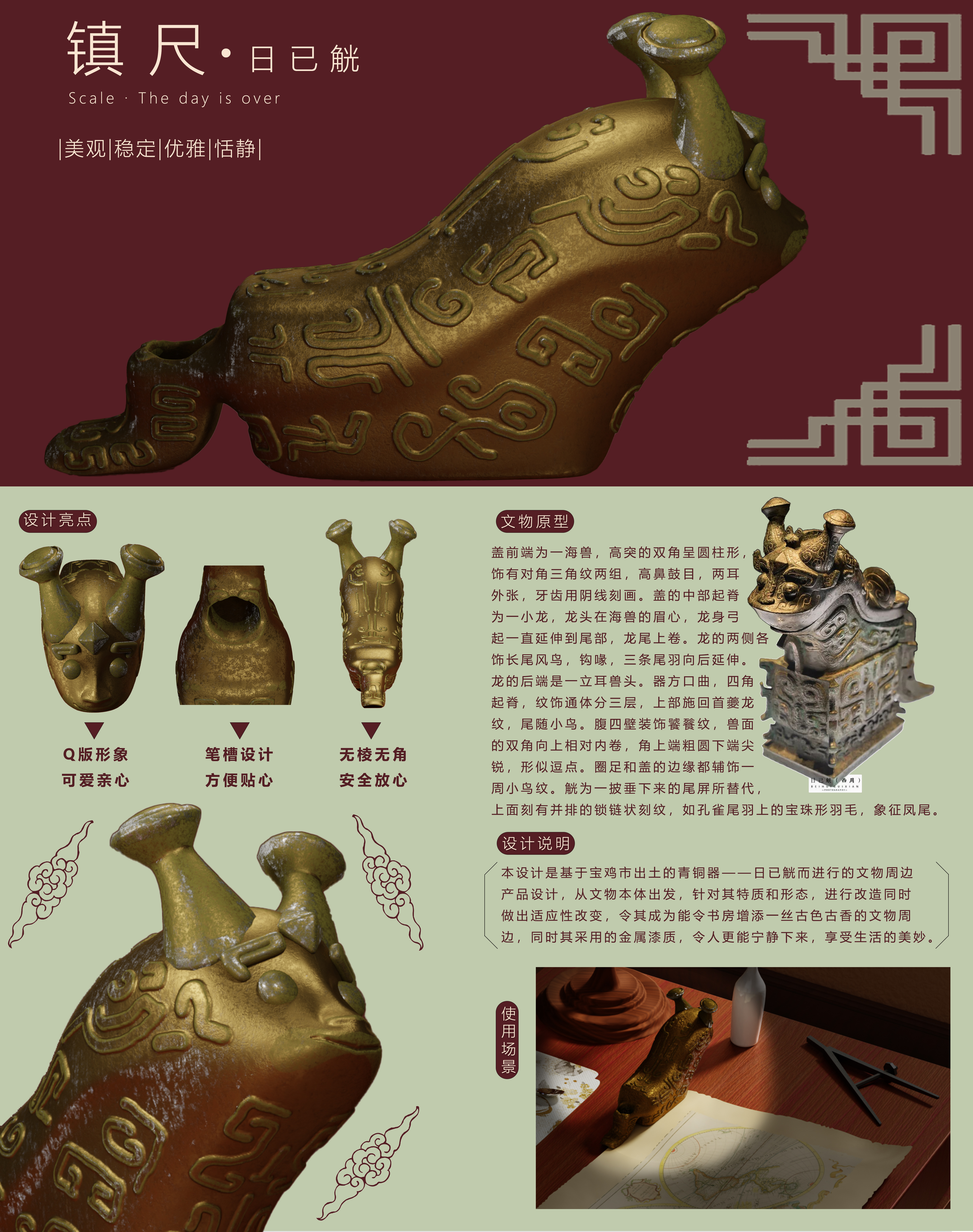 本设计是基于宝鸡市出土的青铜器——日已觥而进行的文物周边产品设计,从文物本体出发,针对其特质和形态,进行改造同时做出适应性改变,令其成为能令书房增添一丝古色古香的文物周边,同时其采用的金属漆质,令人更能宁静下来,享受生活的美妙。