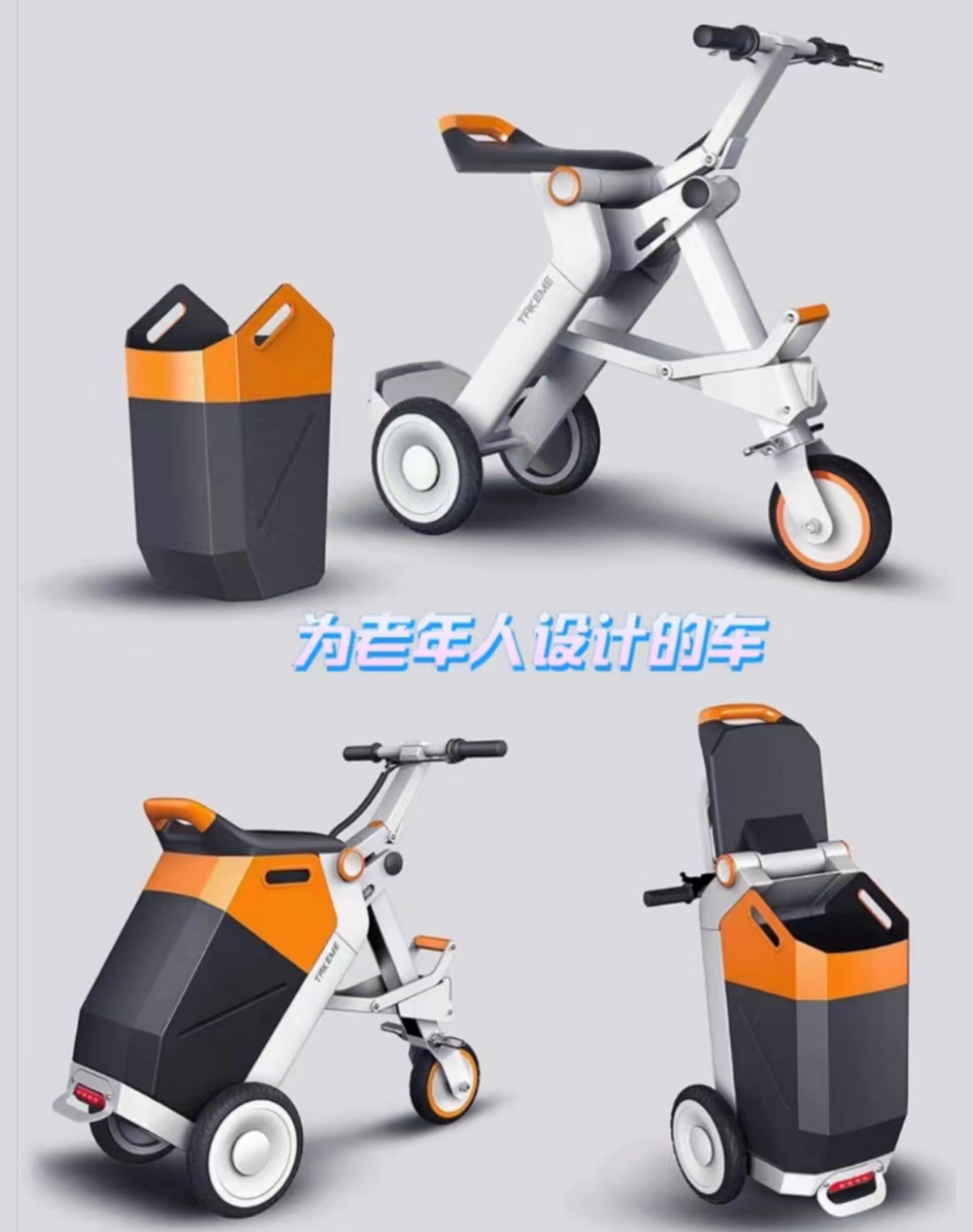 为老年人设计的,其特点是一个折叠系统,它在短短几秒钟内在骑乘、携带和存储模式之间转换。它有电子三轮车和推车的功能,不同的模式适应各种各样的活动,包括通勤,购物。除了拥有增强稳定性和安全性的三轮设计外,其自动折叠系统还创造了一个的骑车体验。