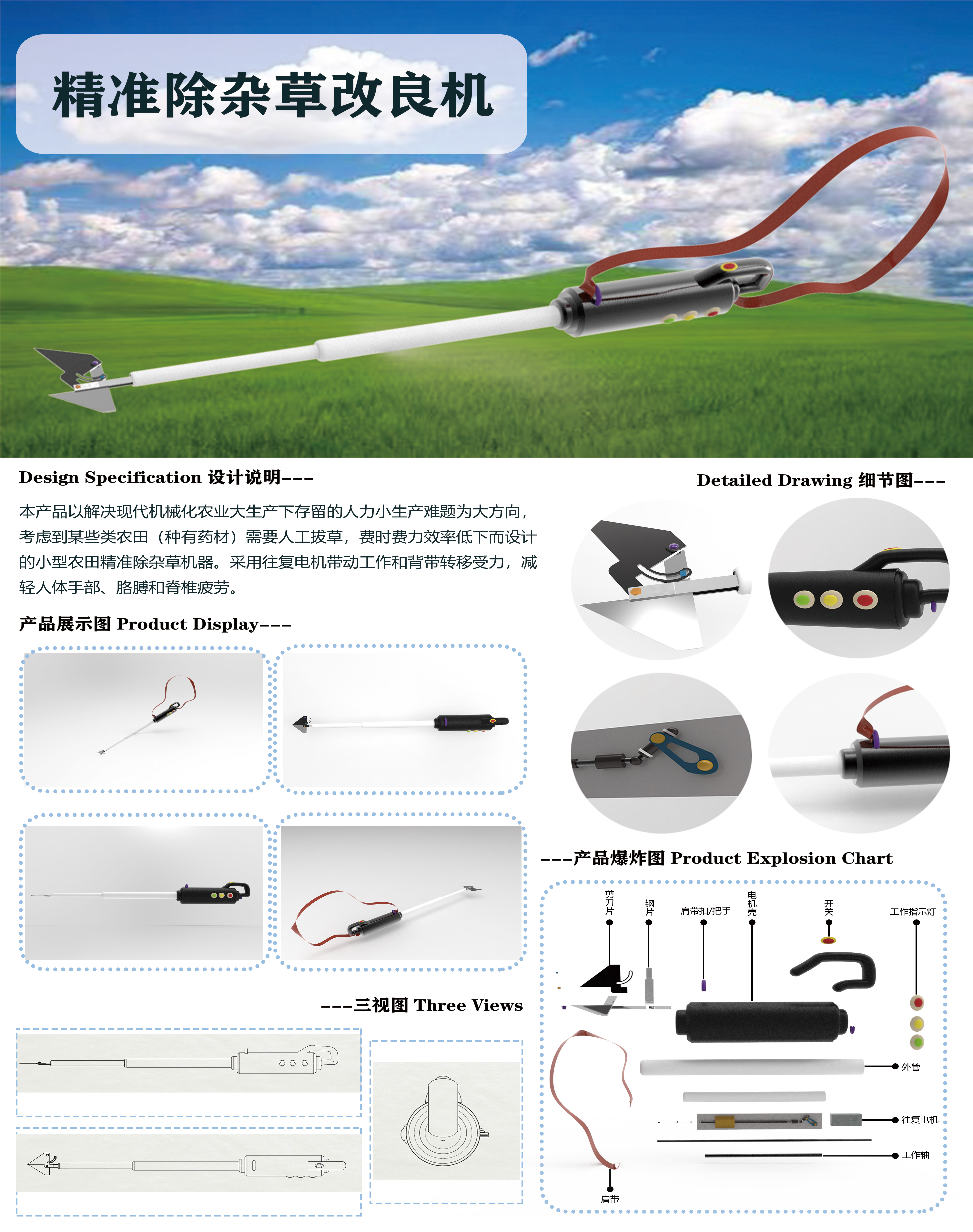 本产品以解决现代机械化农业大生产下存留的人力小生产难题为大方向,考虑到某些类农田(种有药材)需要人工拔草,费时费力效率低下而设计的小型农田精准除杂草机器。采用往复电机带动工作和背带转移受力,减轻人体手部、胳膊和脊椎疲劳。