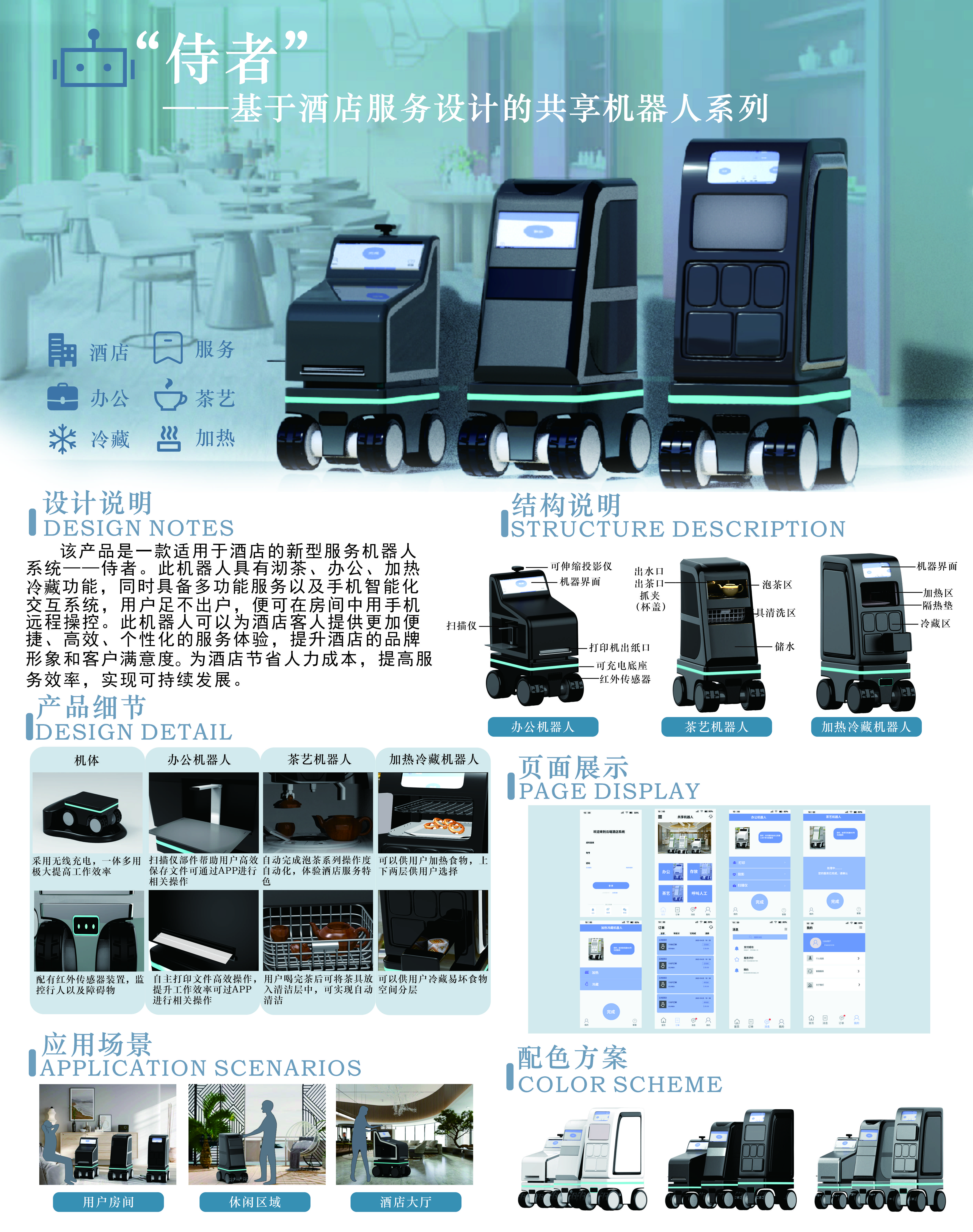 该产品是一款适用于酒店的新型服务机器人系统——侍者。此机器人 具有沏茶、办公、加热保鲜功能,同时具备多功能服务以及手机智能化 交互系统,使用户足不出户,便可在房间中用手机远程操控。此机器人 可以为酒店客人提供更加便捷、高效、个性化的服务体验,提升酒店的 品牌形象和客户满意度,为酒店节省人力成本,提高服务效率,实现可 持续发展。