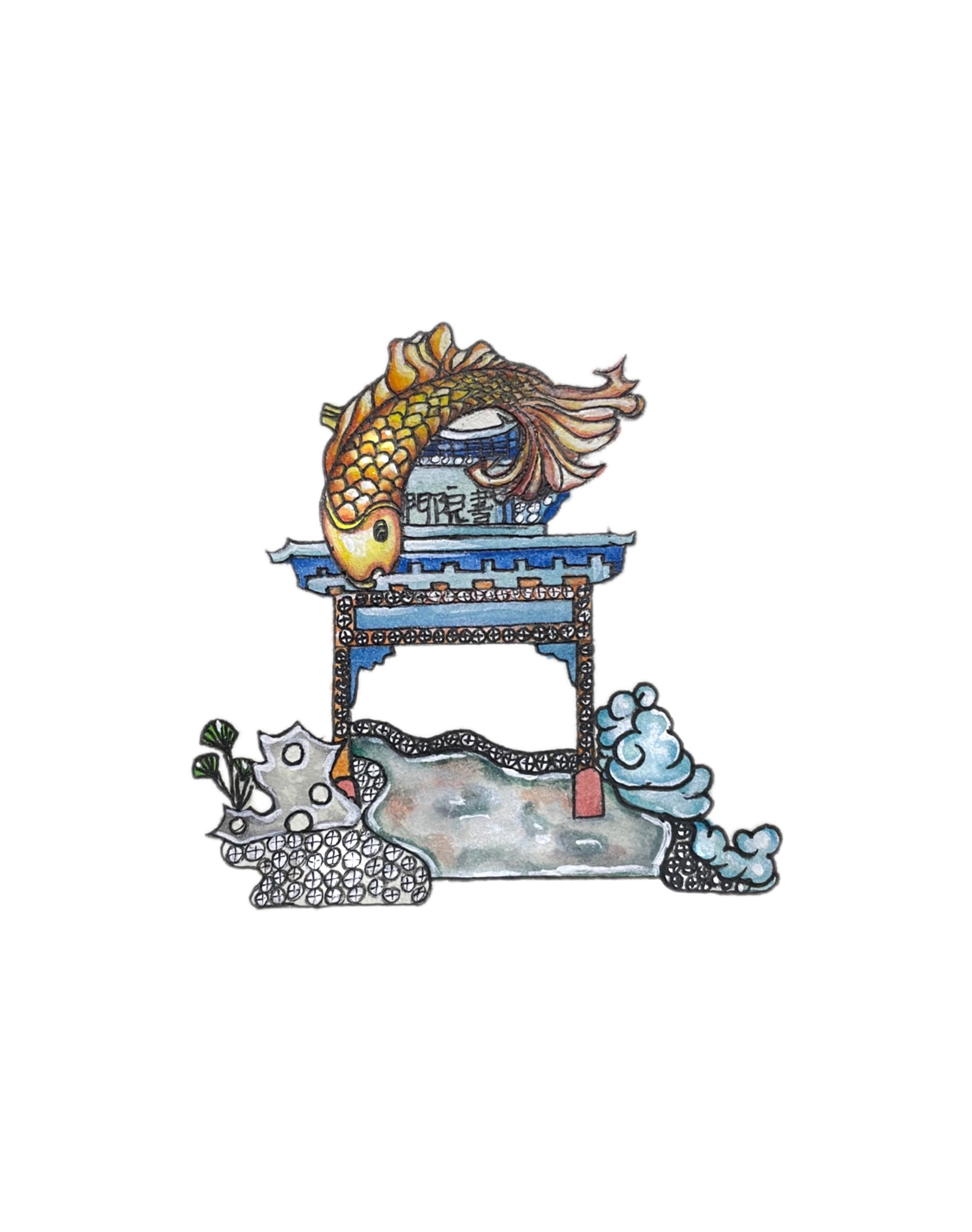 设计中采用锦鲤,象征好运,被誉为“水中牡丹”,还象征飞黄腾达,在图中鲤鱼跳龙门就寓意学生考试考好成绩从而飞黄腾达。门采用了西安建筑书院门,关中书院落座在其中,整条街满满的书香气,把鲤鱼跃龙门和书院门结合在一起,完美的诠释了学子好成绩的愿望。我设计的产品是一个胸针,也可以作为冰箱贴,与西安传统结合在一起,是西安传统文创的不二选择。
