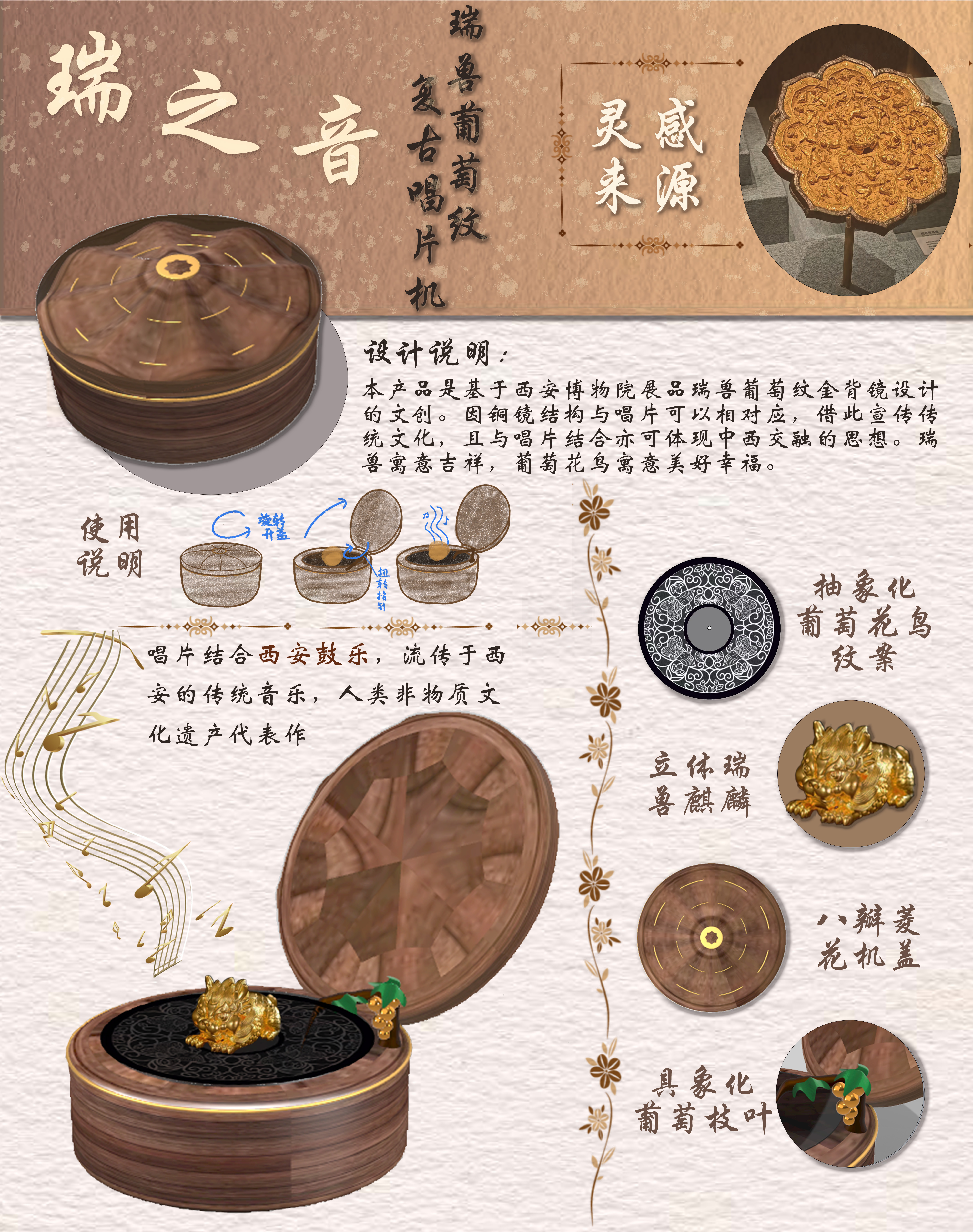 本产品是基于西安博物院展品瑞兽葡萄纹金背镜设计的文创。瑞兽葡萄镜是唐代最具特色的新镜类,将中国传统的瑞兽纹饰与从西方传入的葡萄纹巧妙地结合在一起。因铜镜结构与唱片可以相对应,借此宣传传统文化,且与唱片结合亦可体现中西交融的思想。瑞兽寓意吉祥,葡萄花鸟寓意美好幸福。