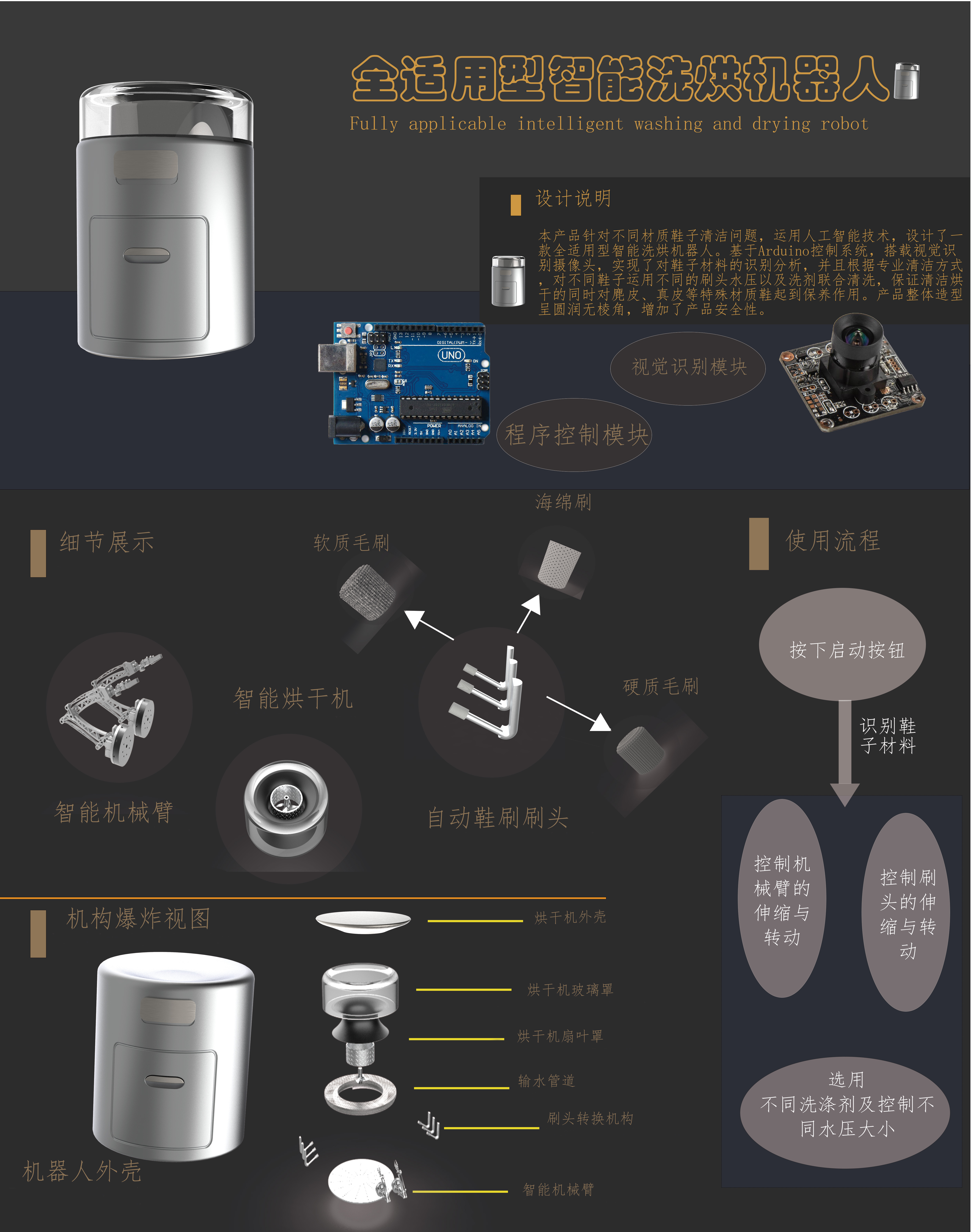 本产品针对不同材质鞋子清洁问题,运用人工智能技术,设计了一款全适用型智能洗烘机器人。基于Arduino控制系统,搭载视觉识别摄像头,实现了对鞋子材料的识别分析,并且根据专业清洁方式,对不同鞋子运用不同的刷头水压以及洗剂联合清洗,保证清洁烘干的同时对麂皮、真皮等特殊材质鞋起到保养作用。产品结构包括智能机械臂、可伸缩式鞋刷等,给用户智能化,全自动的洗鞋体验。整体造型呈圆润无棱角,增加了产品安全性。