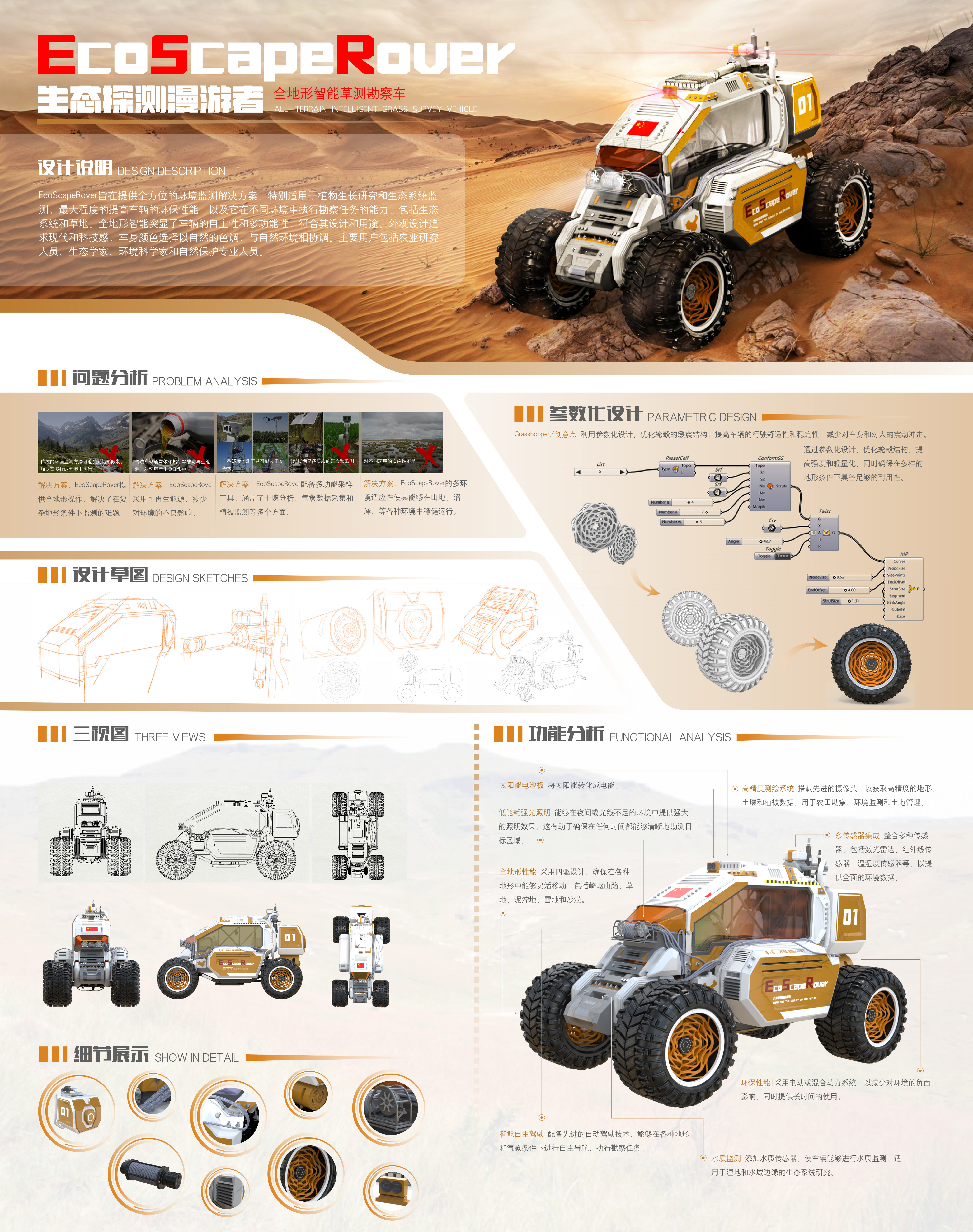 EcoScapeRover旨在提供全方位的环境监测解决方案,特别适用于植物生长研究和生态系统监测。最大程度的提高车辆的环保性能,以及它在不同环境中执行勘察任务的能力,包括生态系统和草地。全地形智能突显了车辆的自主性和多功能性,符合其设计和用途。外观设计追求现代和科技感,车身颜色选择以自然的色调,与自然环境相协调。主要用户包括农业研究人员、生态学家、环境科学家和自然保护专业人员。