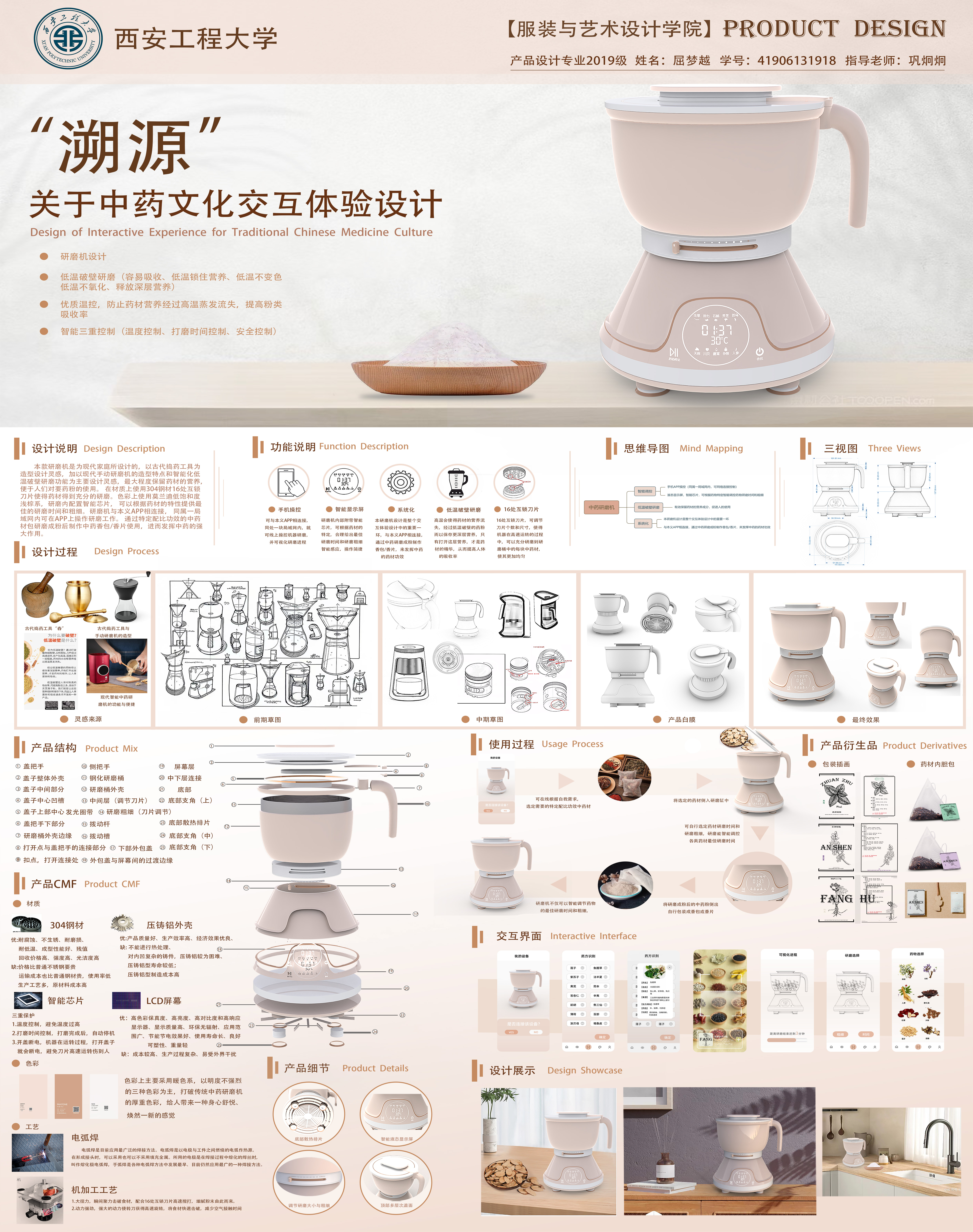 本款研磨机是为现代家庭所设计的,以古代捣药工具为造型设计灵感,加以现代研磨机的造型特点和智能化低温破壁研磨功能为主要设计灵感,最大程度保留药材的营养,便于人们对药粉的使用。材质上使用304钢材16处互锁刀片使得药材得到充分的研磨。色彩上使用莫兰迪色系,研磨内配置智能芯片, 根据药材的特性提供最佳的研磨时间和粗细。 通过特定配比功效的中药材包研磨成粉后制作中药香包/香片使用,进而发挥中药的强大作用。