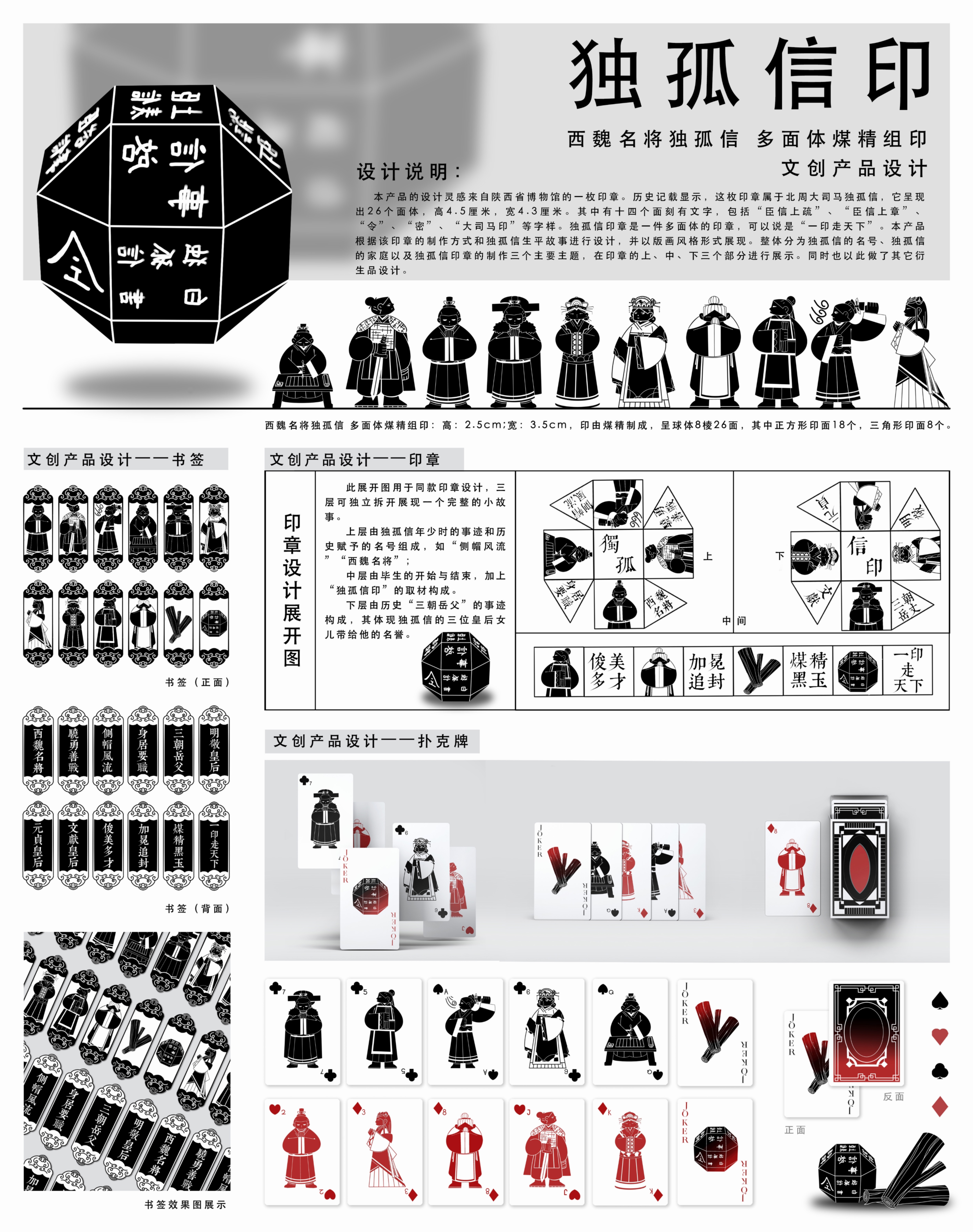 本产品根据文物独孤信印为主题设计。历史上记载煤精石印呈26面体,高4.5厘米,宽4.3厘米,十四面刻有文字,有“臣信上章”、“令”、“密”等,可谓“一印走天下”。产品制作以板画的形式呈现,主题有独孤信本人,家庭,独孤信印何所制三部分组成。上层由孤独信年少时的事迹和历史赋予的名号组成;下层由历史“三朝岳父”的事迹构成,其主要源于他的三个女儿;中层由毕生的开始与结束,加上独孤信印的取材制成构成。