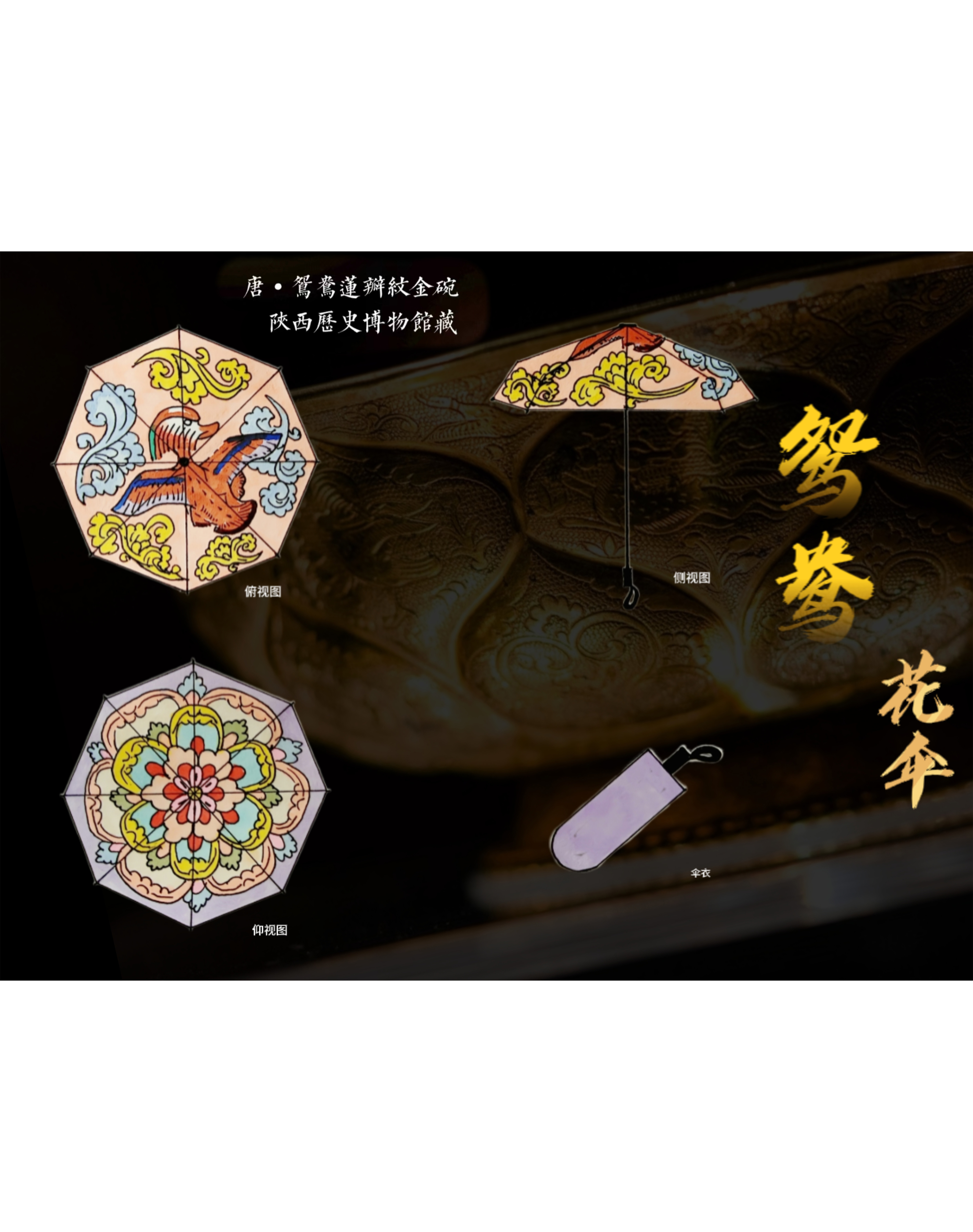 设计灵感来源于陕西历史博物馆藏品唐代鸳鸯莲瓣纹金碗,对碗的花纹进行了提取概括设计,将碗底鸳鸯花纹进行放大,云纹缩小衬托,围绕于伞顶,使用马卡龙配色,让伞的颜色更贴合日常生活使用,将碗内宝相花进行提取设计结合藻井用途置于伞内,寓意美满吉祥。