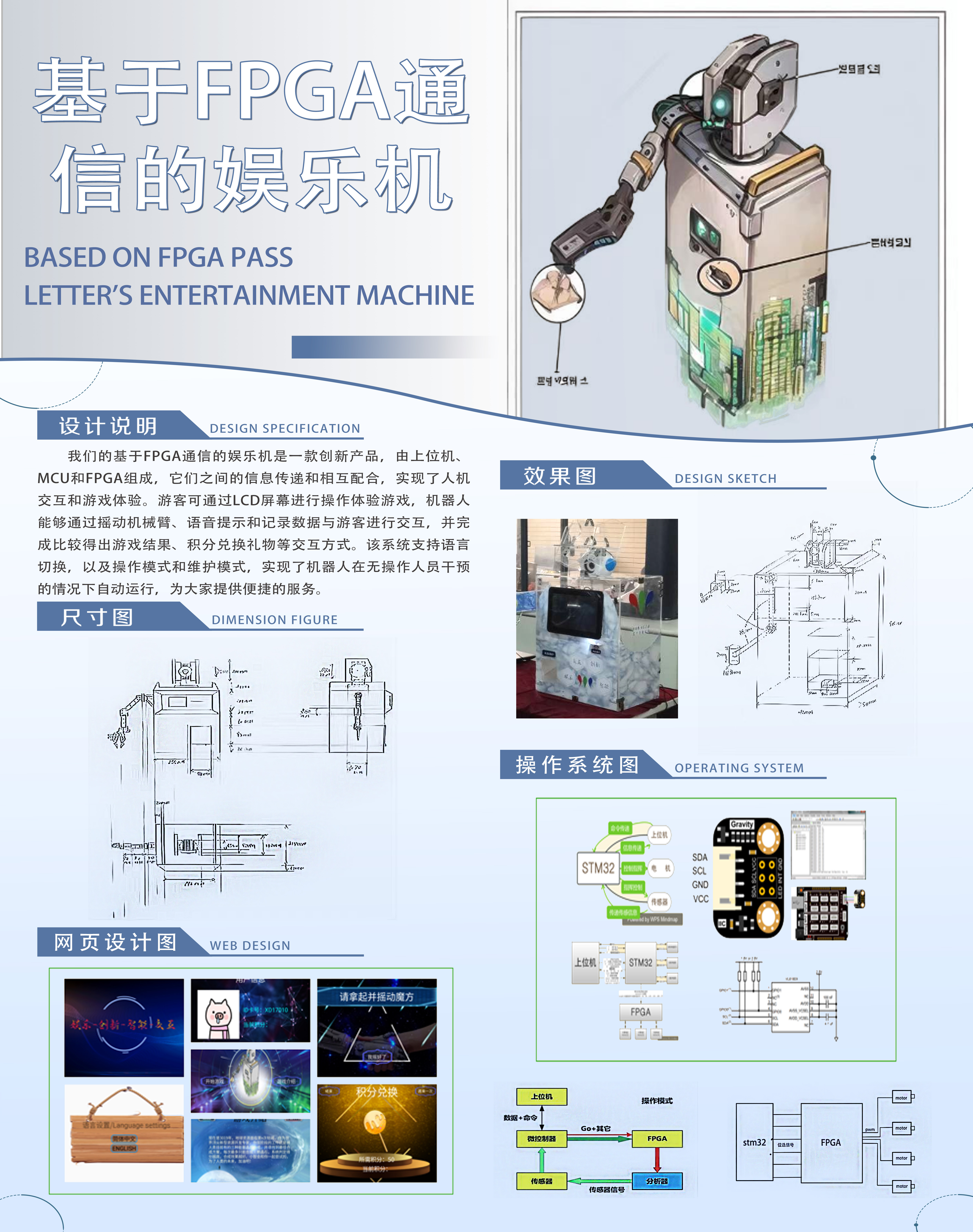 我们的基于FPGA通信的娱乐机是一款创新产品,由上位机、MCU和FPGA组成,它们之间的信息传递和相互配合,实现了人机交互和游戏体验。游客可通过LCD屏幕进行操作体验游戏,机器人能够通过摇动机械臂、语音提示和记录数据与游客进行交互,并完成比较得出游戏结果、积分兑换礼物等交互方式。该系统支持语言切换,以及操作模式和维护模式,实现了机器人在无操作人员干预的情况下自动运行,为大家提供便捷的服务。