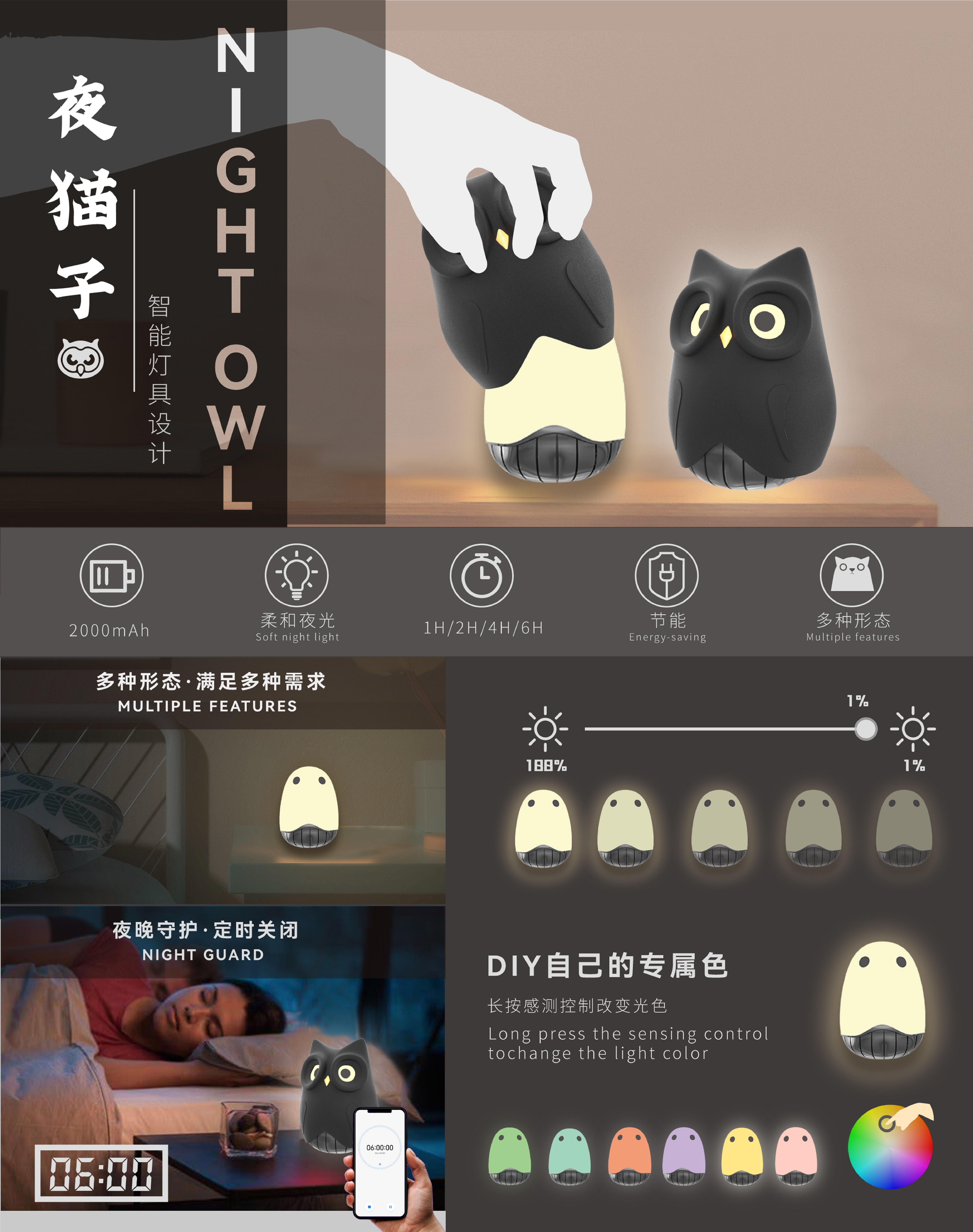 设计灵感来源于当代年轻人常时间熬夜的生活习惯-被称为夜猫子,同时这也是猫头鹰的别称,借此设计“夜猫子”智能灯具,以达到当代年轻人对氛围灯小夜灯的需求。