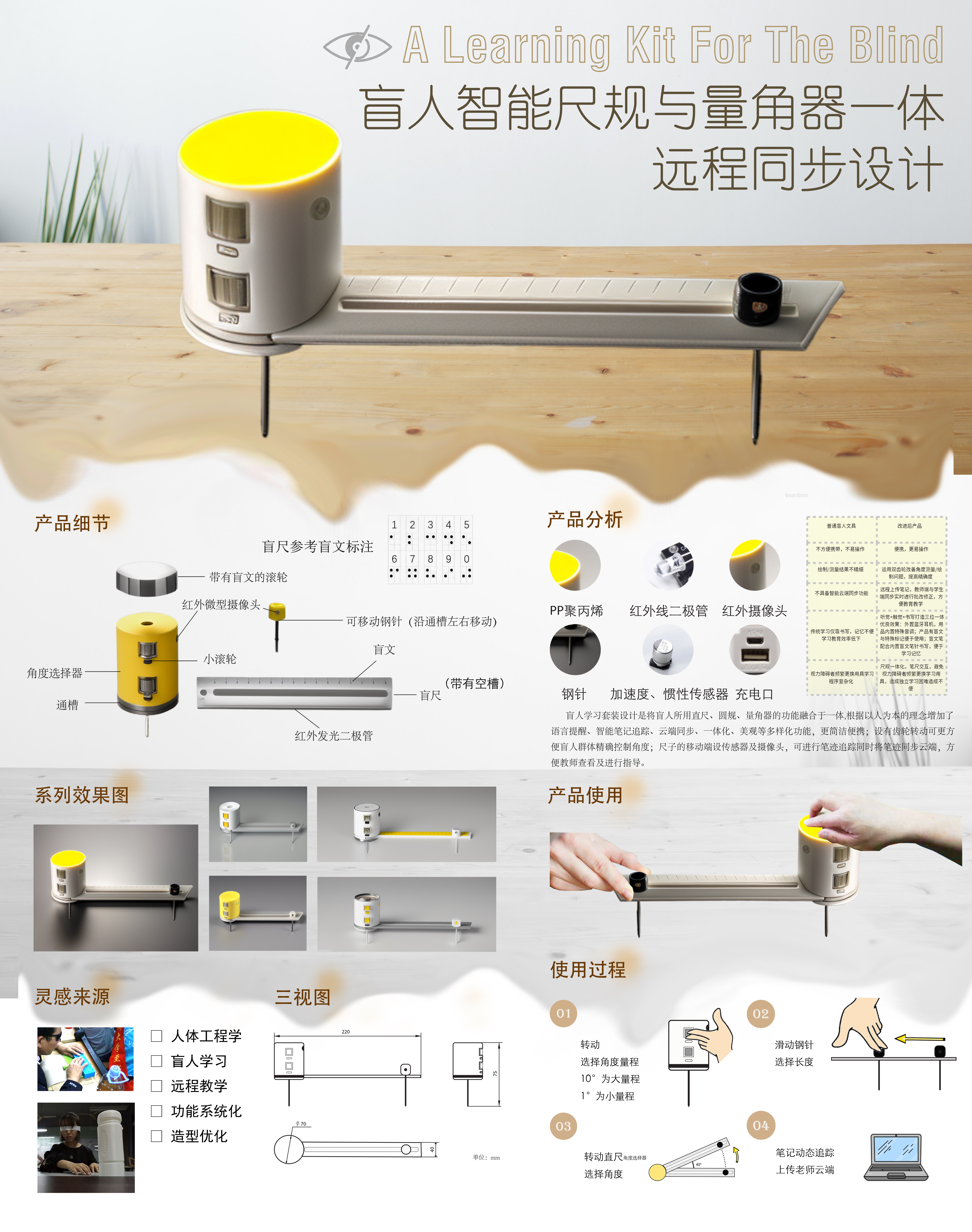 与正常人相比,盲人在学习与绘图过程中工具繁杂,障碍重重,盲人的教师授课时也面临一定挑战。本产品将盲人所用的盲笔、直尺、圆规、量角器等工具融为一体,简洁便携;设有滚轮转动的双量程选择角度装置,可更方便盲人精确控制角度;尺子带有红外二极管,钢针移动端设加速度、惯性传感器及红外摄像头,可进行笔迹动态追踪,同时实现无线传输,将笔迹同步云端,方便教师查看及进行指导,提高盲人的学习效率,使绘图更为精确简便。