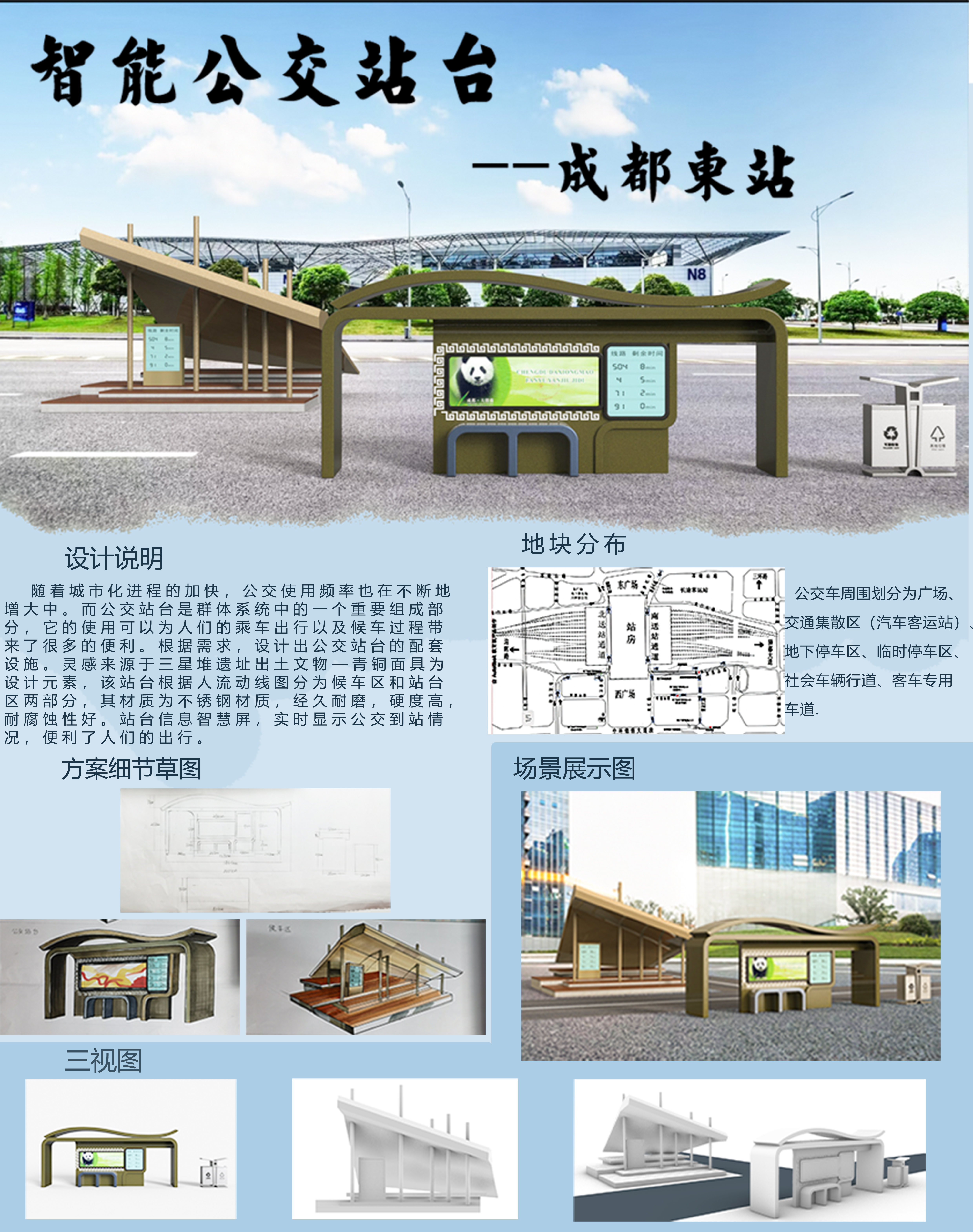 随着城市化进程的加快,公交使用频率也在不断地 增大中。而公交站台是群体系统中的一个重要组成部 分,它的使用可以为人们的乘车出行以及候车过程带 来了很多的便利。根据需求,设计出公交站台的配套 设施。灵感来源于三星堆遗址出土文物—青铜面具为 设计元素,该站台根据人流动线图分为候车区和站台 区两部分,其材质为不锈钢材质,经久耐磨,硬度高, 耐腐蚀性好。站台信息智慧屏,实时显示公交到站情 况、。