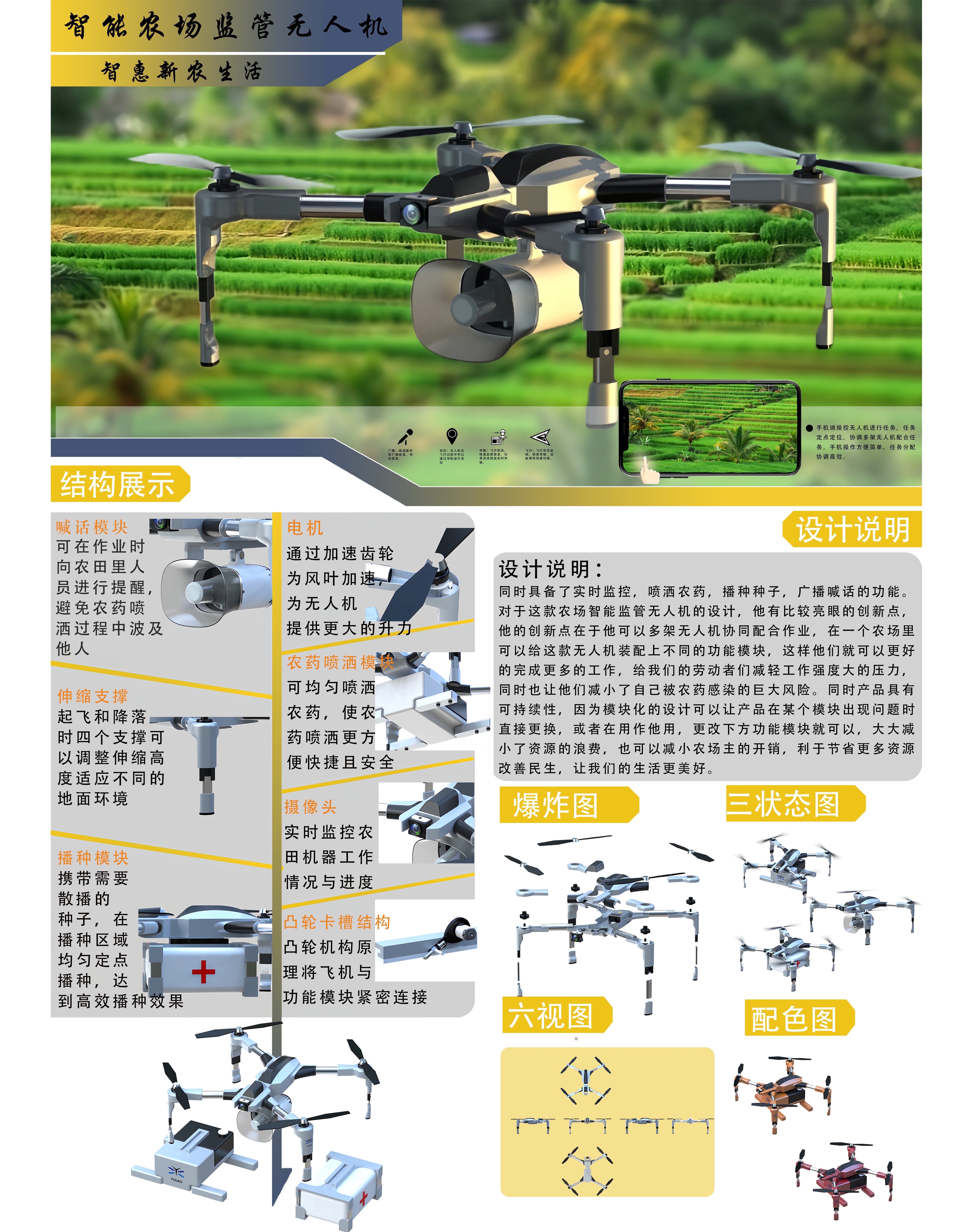 同时具备了实时监控,喷洒农药,播种种子,广播喊话的功能。他的创新点在于他可以多架无人机协同配合作业,在一个农场里可以给这款无人机装配上不同的功能模块,这样他们就可以更好的完成更多的工作,给我们的劳动者们减轻工作强度大的压力,同时也让他们减小了自己被农药感染的巨大风险。同时产品具有可持续性,因为模块化的设计可以让产品在某个模块出现问题时直接更换,或者在用作他用,更改下方功能模块就可以。