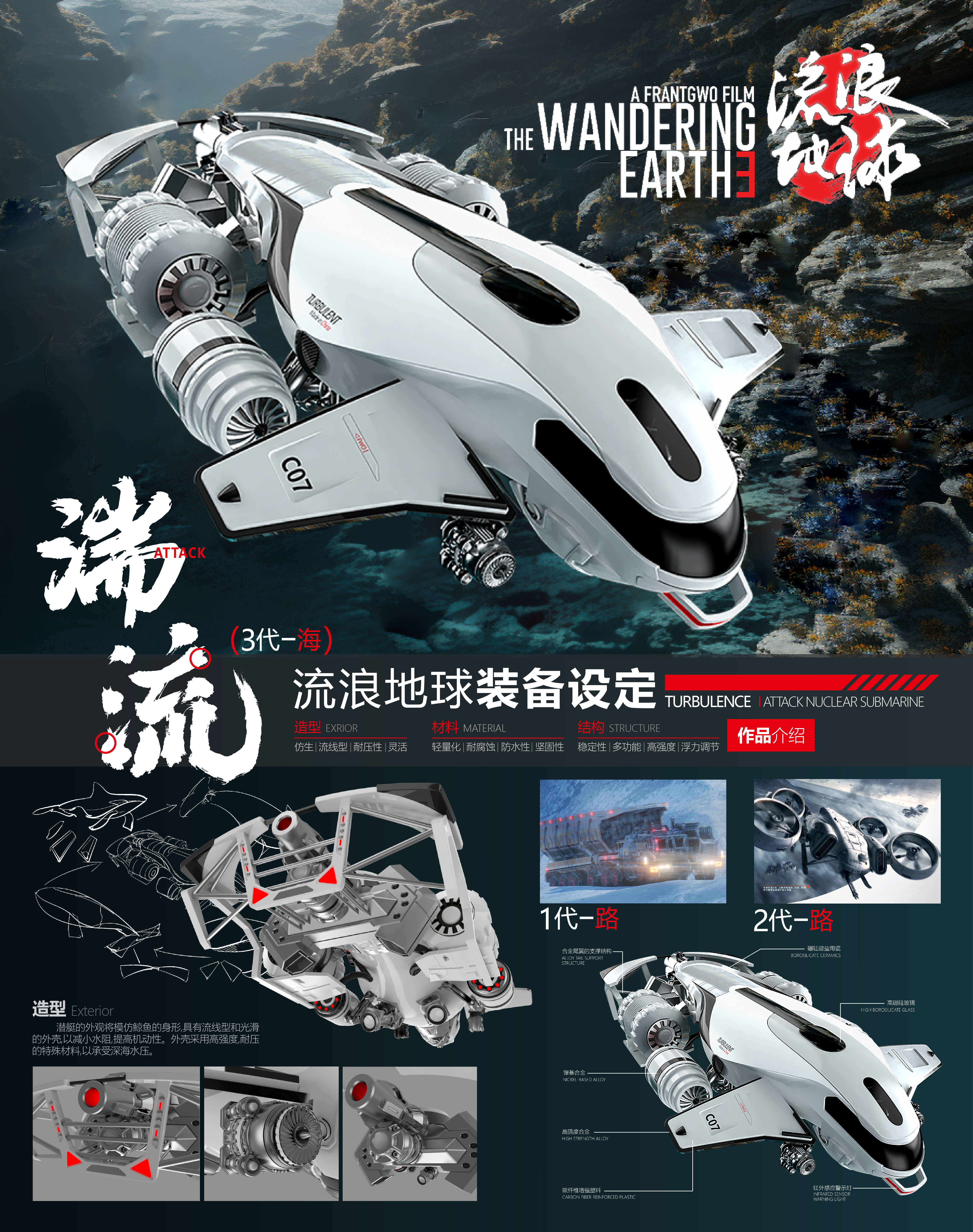 “湍流”攻击型核潜艇的设计灵感源自自然界中的水流与湍流,以及人类对于流浪地球的追求与抵抗。我们希望通过这款核潜艇,体现出人类的团结、创新和对未来的希望。核潜艇的名字“湍流”也象征着我们在流浪地球的漫长旅程中要克服的种种挑战,正如水流穿越湍流一样,我们将克服困难,前行向未来。它代表了人类的希望和坚韧。我们希望这款核潜艇能够在流浪地球的旅程中发挥重要作用。