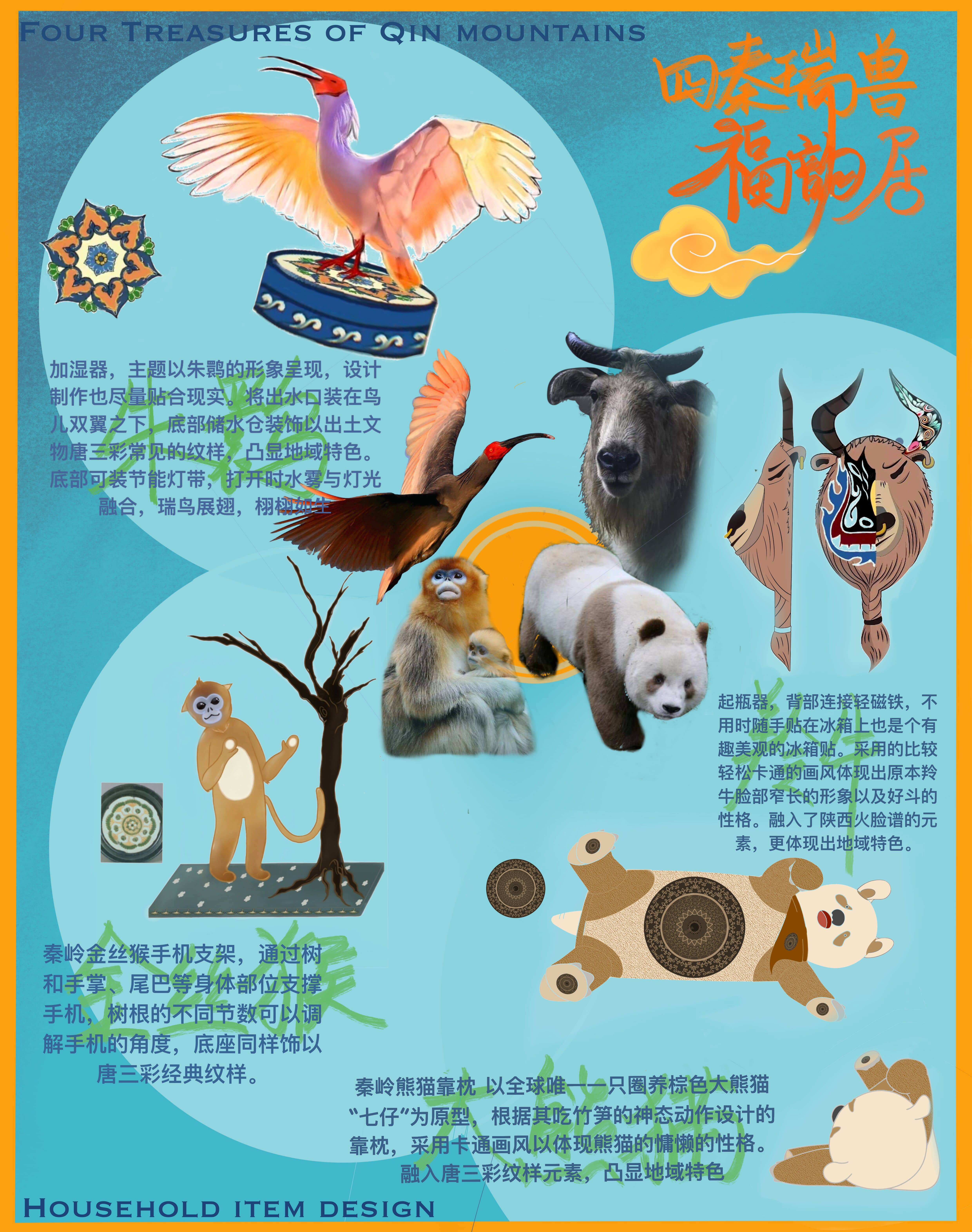 绵延的秦岭山脉穿过,对陕西风土文化产生了悠远的影响。我们就以秦岭四兽(大熊猫、朱鹮、金丝猴、羚牛)为灵感创作出四项家具产品,并定名为“四秦瑞兽华韵居”。三名作者以不同的理解和角度分别融入唐三彩、戏曲等地方特色文化元素设计产品,风格迥异,趣味盎然。希望能给消费者带来不一样的使用体验。瑞兽送福,带来运势兴旺,幸福安康。