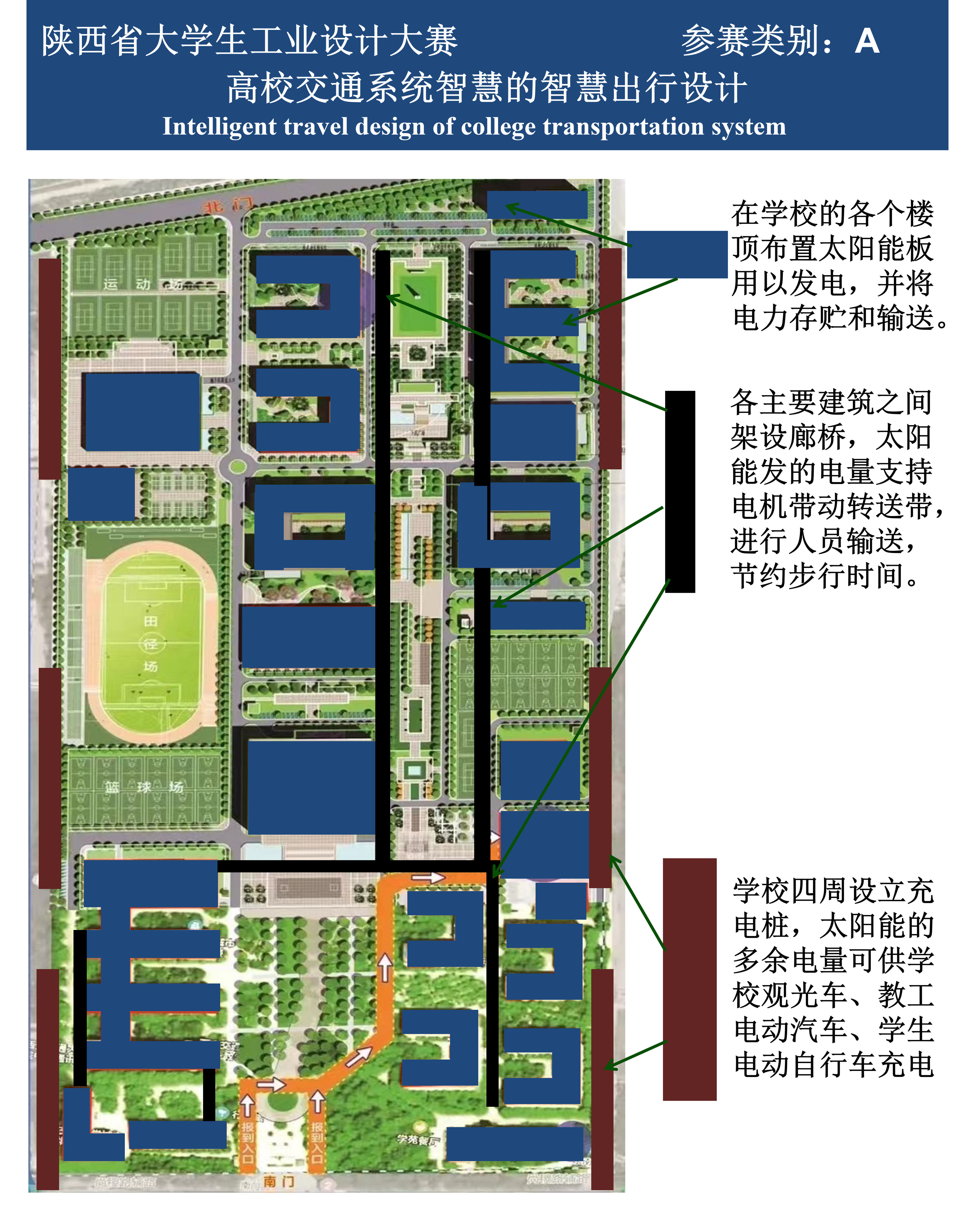 我们的作品是在学校各个教学楼和宿舍楼之间架设廊桥,利用学校各个楼顶的闲置空地铺上太阳能板,利用清洁高效免费的太阳能来发电,支持电机带动传送带,进行人员运输,节省步行时间和不怕风吹雨淋。还可以在学校四周设立充电桩,用多余的太阳能电量给学校观光车,教职工电动汽车和学生的电动车充电。我们的作品充分利用太阳能这一种清洁高效的能源,大大降低了二氧化碳排放,早日实现我国碳中和的伟大目标。