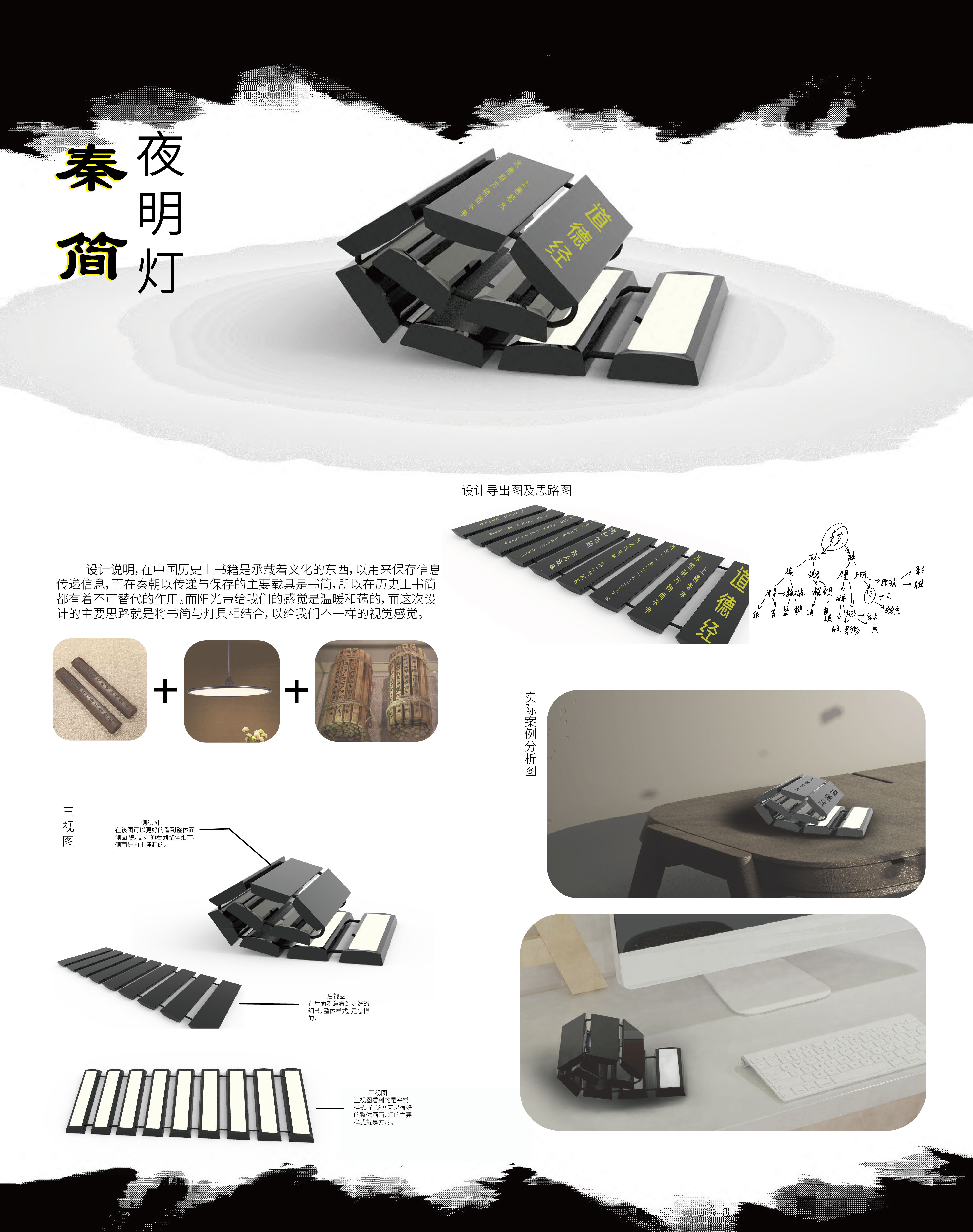 设计说明,在中国历史上书籍是承载着文化的东西,以用来保存信息 传递信息,而在秦朝以传递与保存的主要载具是书简,所以在历史上书简 都有着不可替代的作用。而阳光带给我们的感觉是温暖和蔼的,而这次设 计的主要思路就是将书简与灯具相结合,以给我们不一样的视觉感觉。
