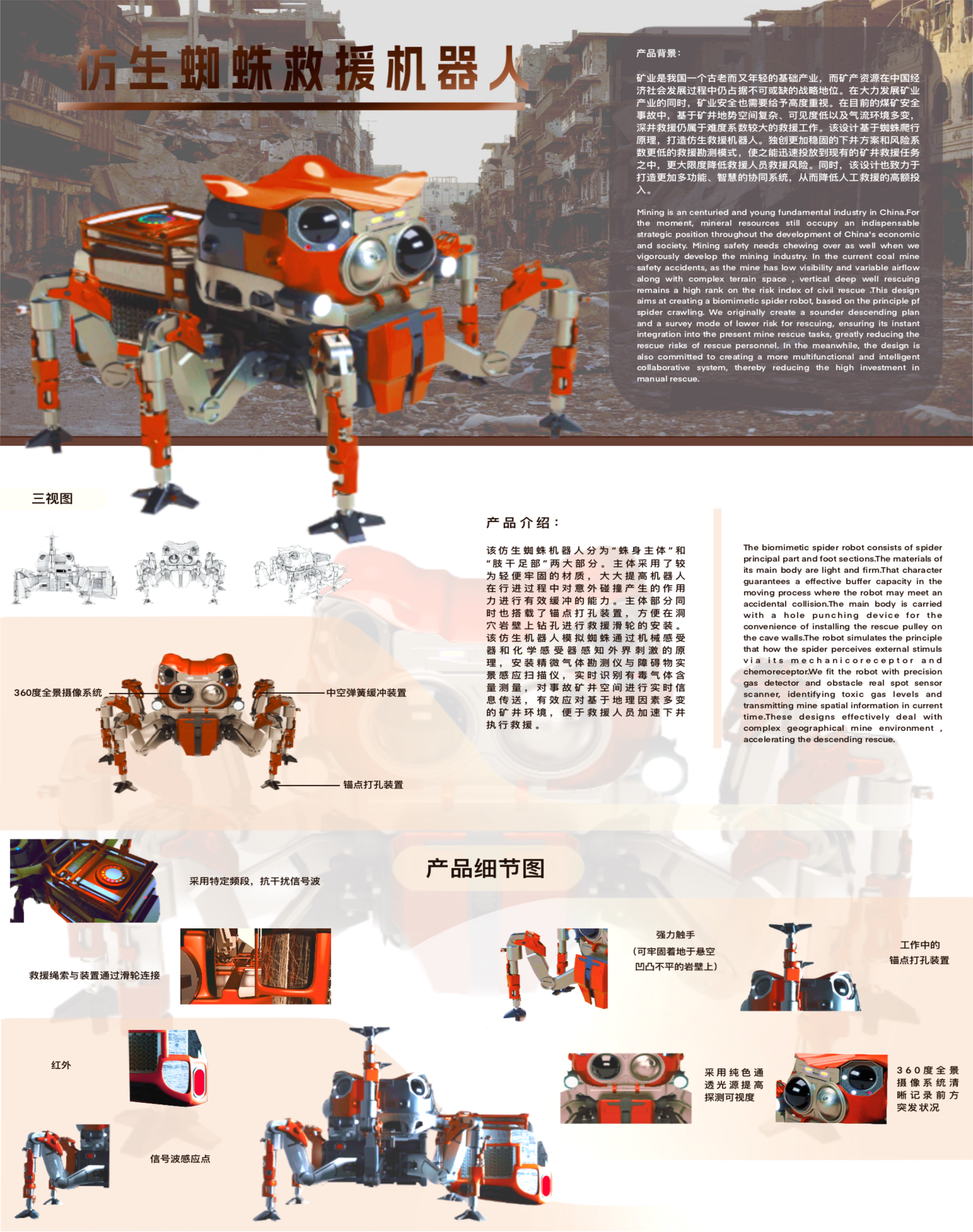 该仿生蜘蛛机器人分为“蛛身主体”和“肢干足部”两大部分。主体采用了较为轻便牢固的材质,减轻意外碰撞产生的作用力。主体部分同时也搭载了锚点打孔装置,便于洞穴岩壁上钻孔和救援滑轮的安装。该仿生机器人模拟蜘蛛通过机械感受器和化学感受器感知外界刺激的原理,安装精微气体勘测仪与障碍物实景感应扫描仪,实时识别有毒气体含量测量并进行实时信息传送,有效应对基于地理因素多变的矿井环境,便于救援人员加速下井执行救援。