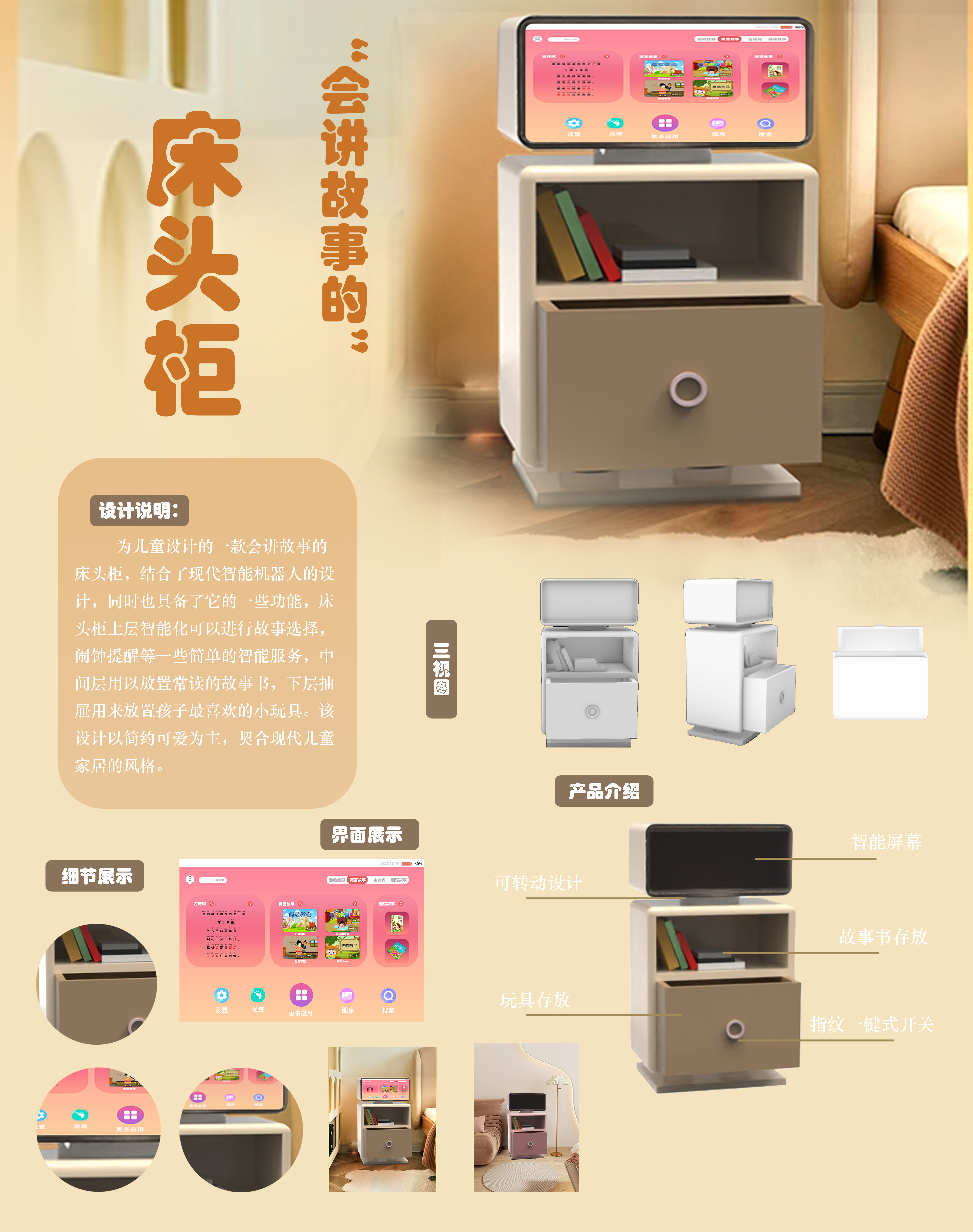 为儿童设计的一款会讲故事的床头柜,结合了现代智能机器人的设计,同时也具备了它的一些功能,床头柜上层智能化可以进行故事选择,闹钟提醒等一些简单的智能服务,中间层用以放置常读的故事书,下层抽屉用来放置孩子最喜欢的小玩具。该设计以简约可爱为主,契合现代儿童家居的风格。