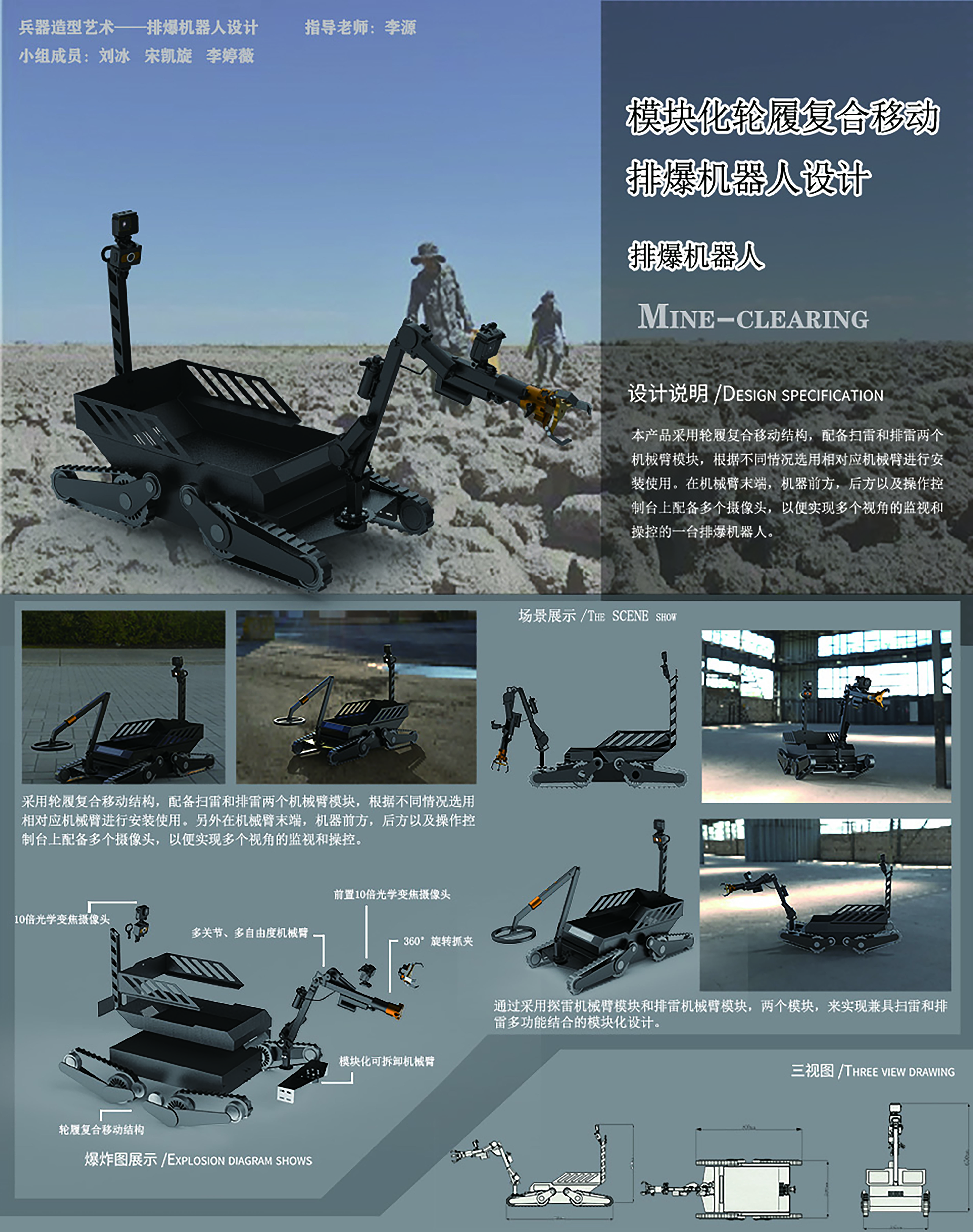 本产品采用轮履复合移动结构,配备扫雷和排雷两个机械臂模块,根据不同情况选用相对应机械臂进行安装使用。另外,在两个机械臂末端,机器前方以及后方以及操作控制台上配备多个摄像头,以便实现多个视角的监视和操控的一台排爆机器人。