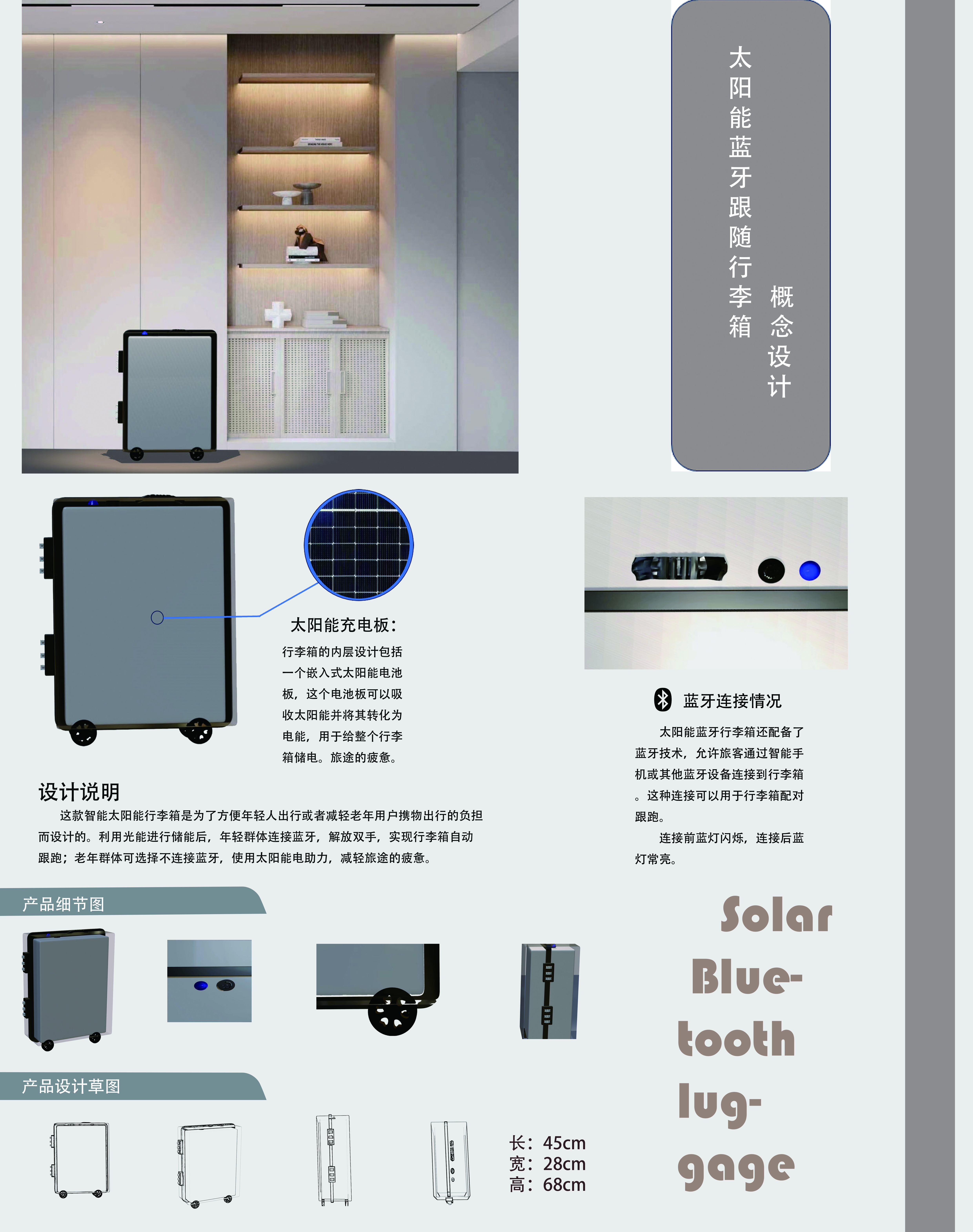 这款智能太阳能行李箱是为了方便年轻人出行或者减轻老年用户携物出行的负担而设计的。整个行李箱分为内层和外层,内层为太阳能板,外层为有突出的冲击韧性、透明性和尺寸稳定性且价格低廉的PC材料板。利用光能进行储能后,年轻群体连接蓝牙,解放双手,实现行李箱自动跟跑;老年群体可选择不连接蓝牙,使用太阳能电助力,减轻旅途的疲惫。