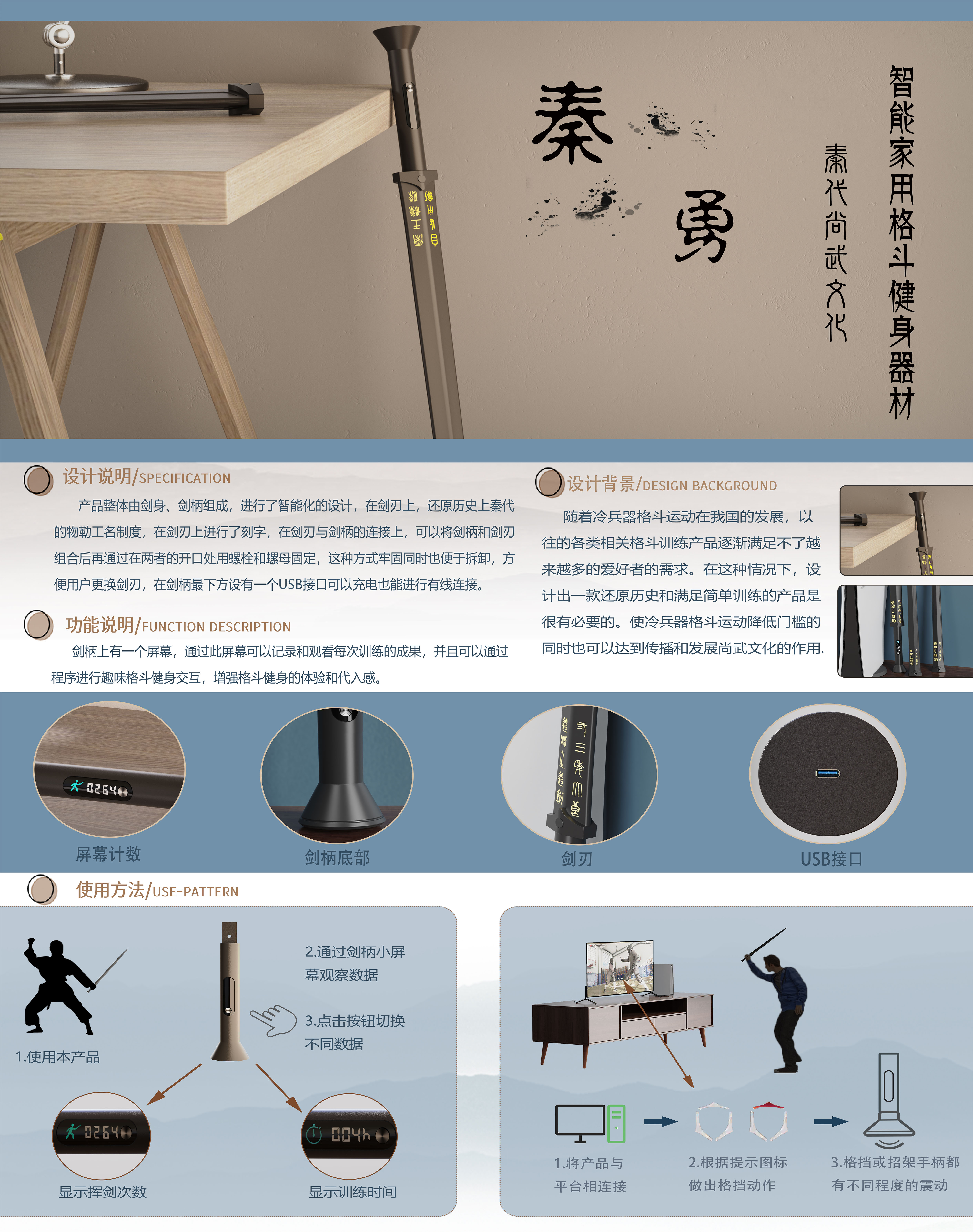 产品整体由剑身、剑柄组成。在剑刃上,为了还原历史上秦代的每把兵器制作后都会刻字这一制度,同时也为了增加趣味性,在剑刃上进行了刻字,还可更换剑刃,感受不同形制秦剑的魅力。剑柄采用智能化设计,在屏幕可以记录和看到用户的挥剑次数和不同的挥击力度。记录每次训练的成果,并且可以通过与APP连接查看更详细的数据。产品也可以通过APP与部分冷兵器格斗类的电子游戏相连接,增强游戏的体验和代入感。