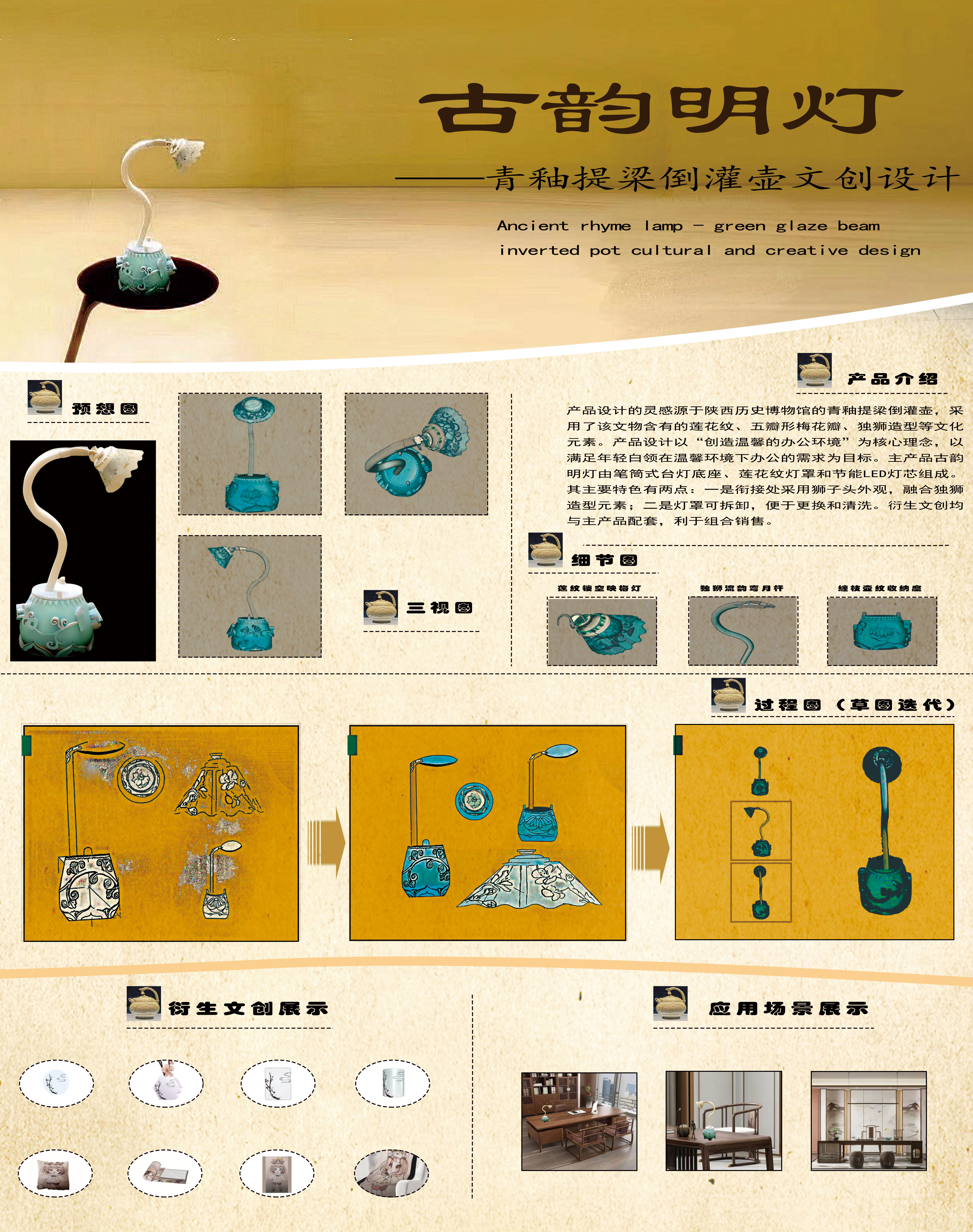 产品设计的灵感源于陕西历史博物馆的青釉提梁倒灌壶,采用该文物含有的莲花纹、梅花瓣、独狮造型等元素。产品设计以“创造温馨的办公环境”为核心理念,致力于满足年轻白领舒缓办公压力的需求,契合“进化、协调”的主题。主产品古韵明灯由笔筒式台灯底座、莲花纹灯罩和节能LED灯芯组成。其主要特色有以下两点:一是衔接处融合文物含有的独狮造型元素;二是灯罩可拆卸,便于更换和清洗。衍生文创均与主产品配套,利于组合销售。