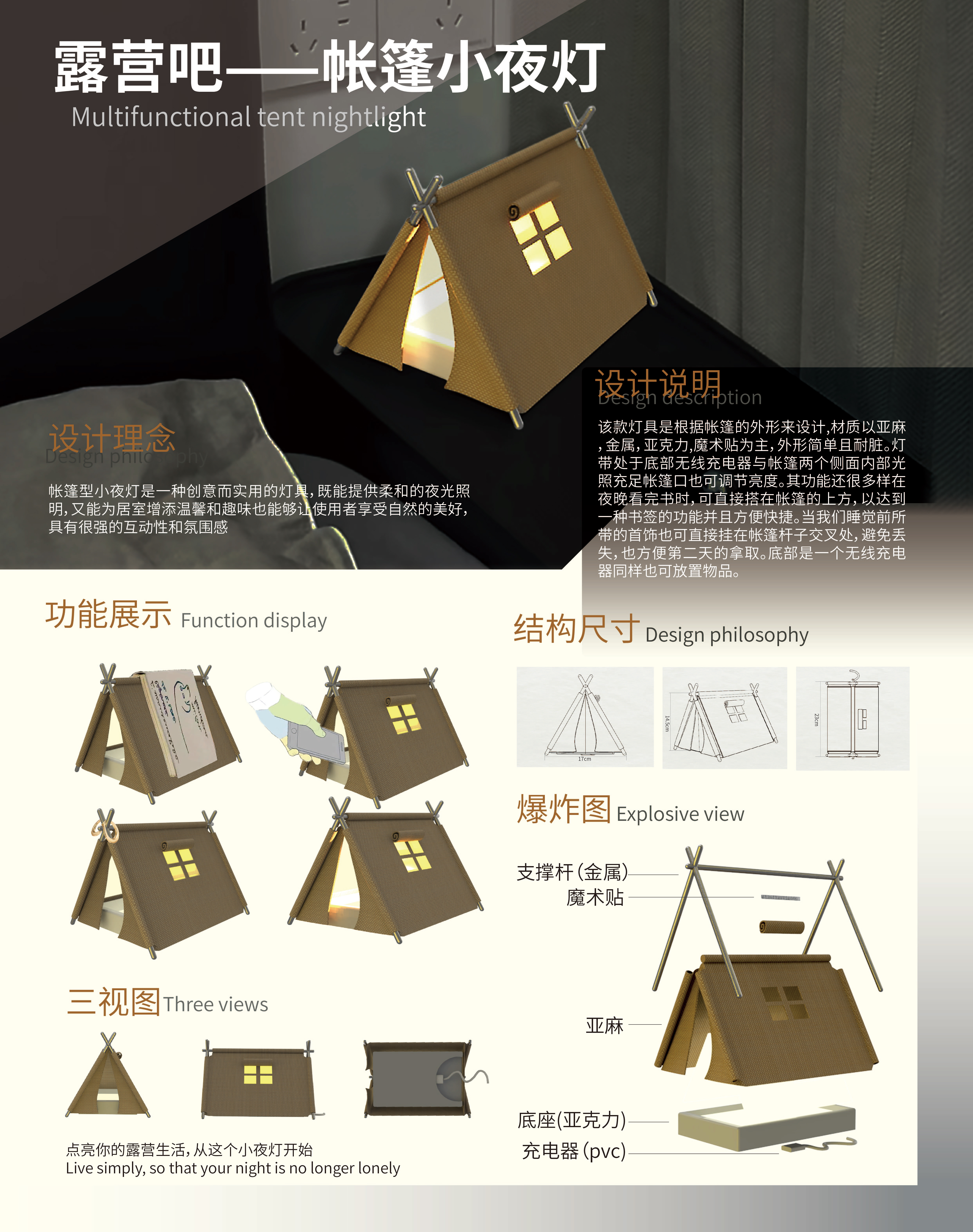 该款灯具是根据帐篷的外形来设计,外形简单且耐脏。灯带处于底部无线充电器与帐篷两个侧面内部,帐篷口可调节亮度,帐篷窗户上的帘子也附有魔术贴可拉合,增加了它的趣味性合互动性使其氛围更加温馨。其功也很多样,在夜晚看完书后可直接搭在帐篷的上方,以达到一种书签的功能并快捷方便。当我们睡觉前所带的首饰也可直接挂在帐篷杆子交叉处,避免丢失,也方便第二天的拿取。底部是一个无线充电器同样也可放置物品。