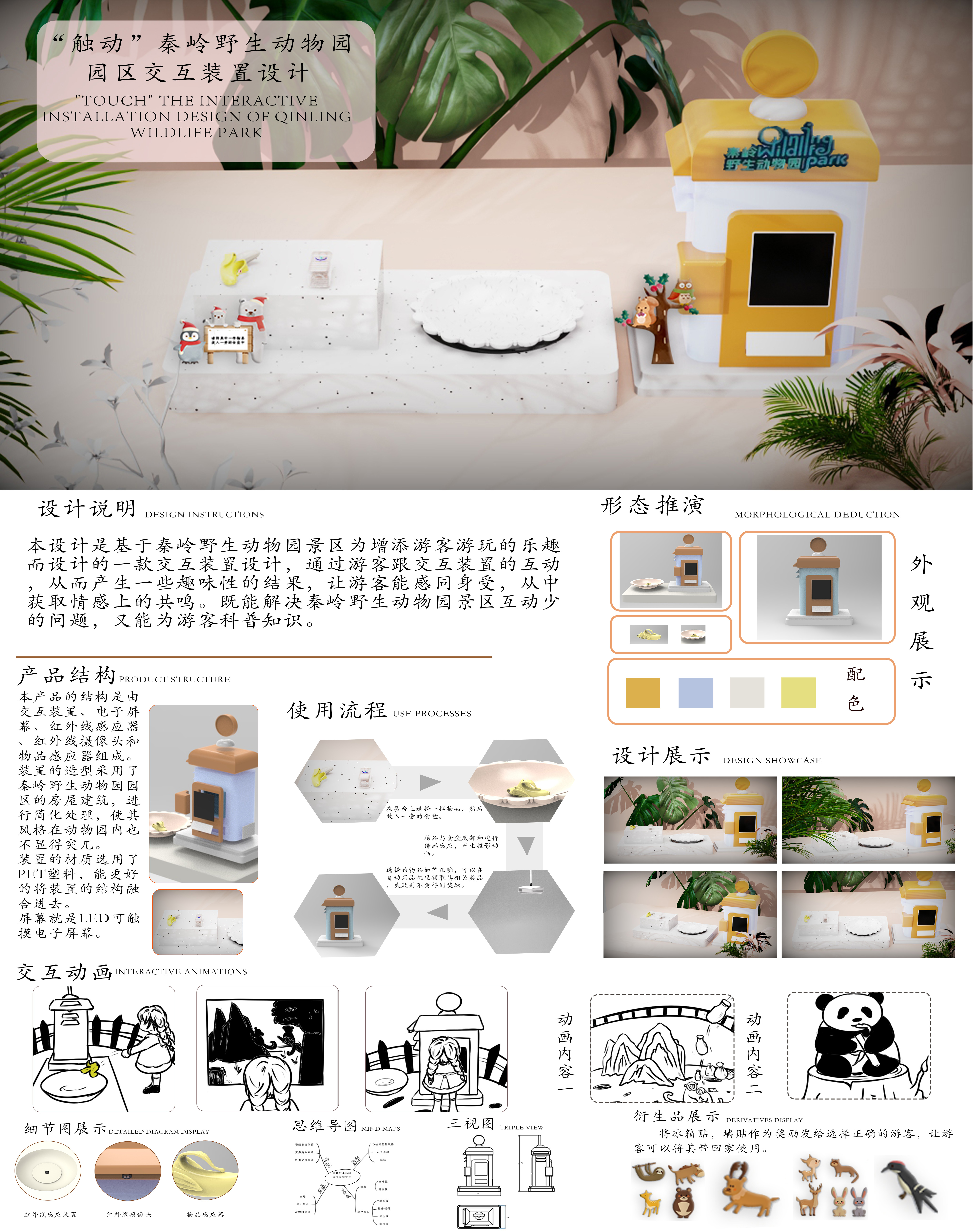 本设计是基于秦岭野生动物园景区为增添游客游玩的乐趣而设计的一款交互装置设计,通过游客跟交互装置的互动,从而产生一些趣味性的结果,让游客能感同身受,从中获取情感上的共鸣。既能解决秦岭野生动物园景区互动少的问题,又能为游客科普知识。