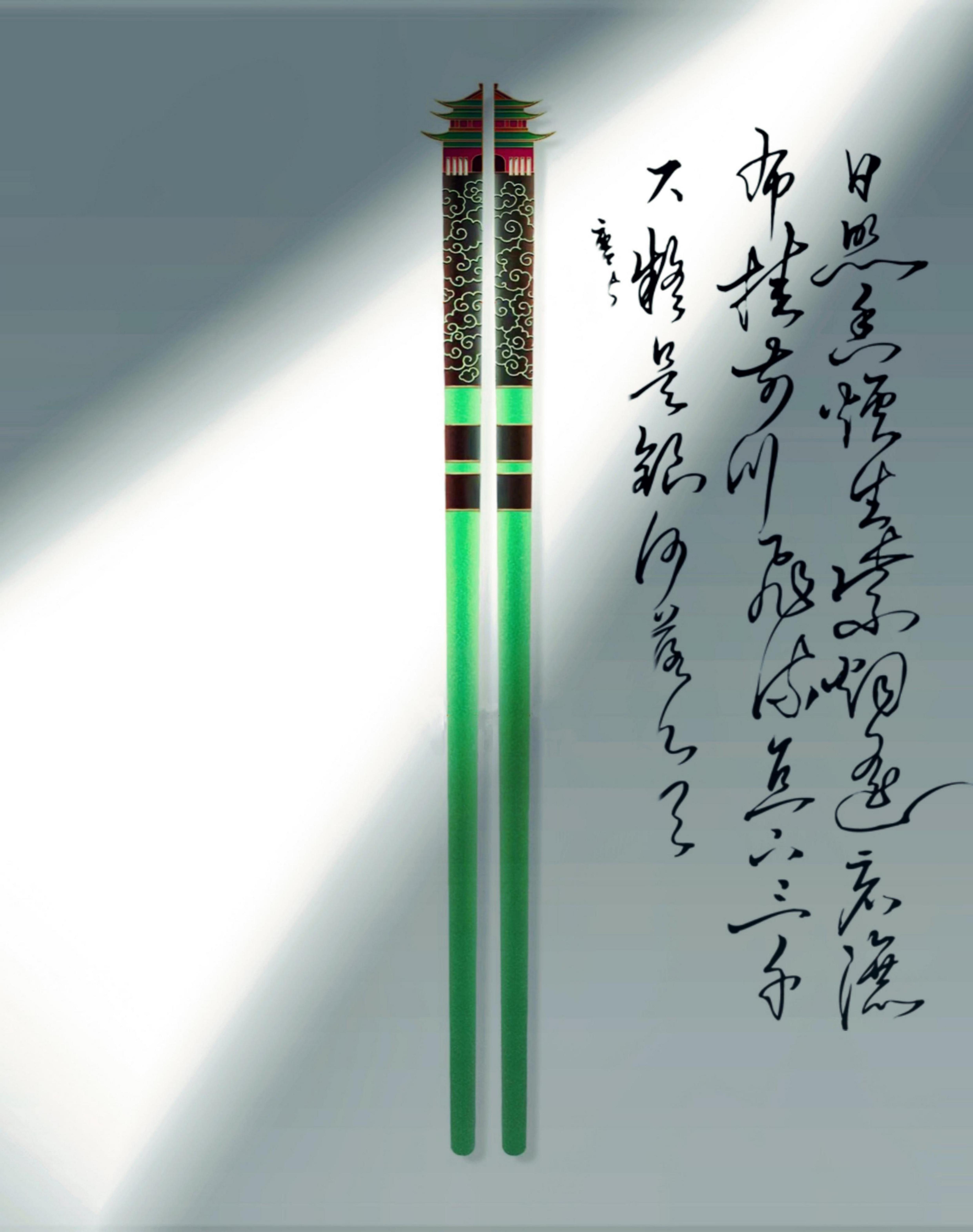 以陕西传统建筑钟楼为设计灵感,添加传统纹样元素祥云纹。设计出一双含有文化韵味的筷子,结合泱泱中华民族上下五千年历史,运用“日照香炉生紫烟,遥看瀑布挂前川。”诗句作为设计图背景,有丰富的文化韵味。