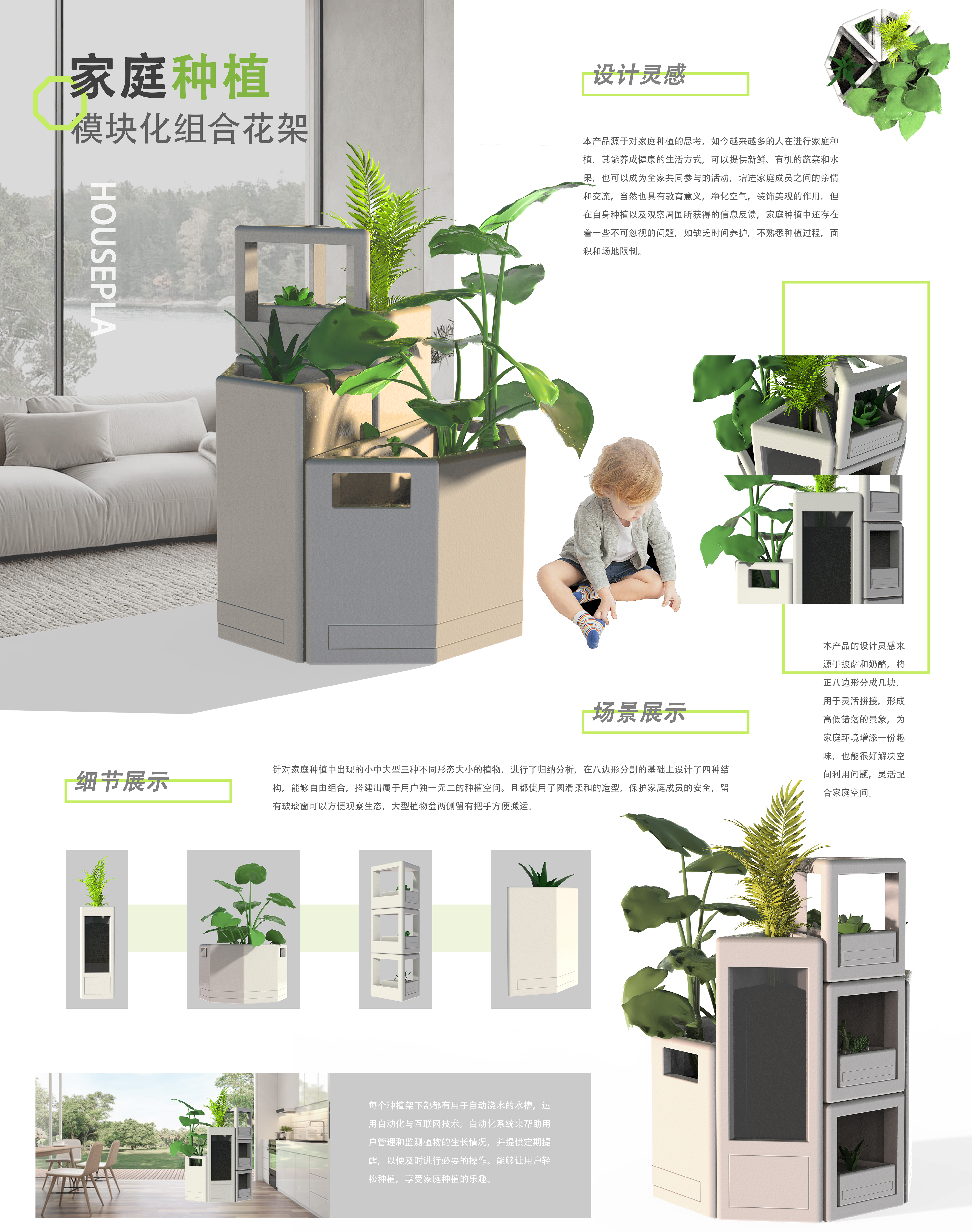 本产品源于对家庭种植的思考,如今越来越多的人在进行家庭种植,其能养成健康的生活方式,增进家庭成员之间的亲情和交流。针对于家庭种植中出现的小中大型三种不同形态大小的植物,进行了归纳分析,能够自由排列组合,搭建出属于用户独一无二的种植空间。每个种植架下部运用自动化与互联网技术,自动化系统来帮助用户管理和监测植物的生长情况,并提供定期提醒,以便及时进行必要的操作。能够让用户轻松种植,享受家庭种植的乐趣。