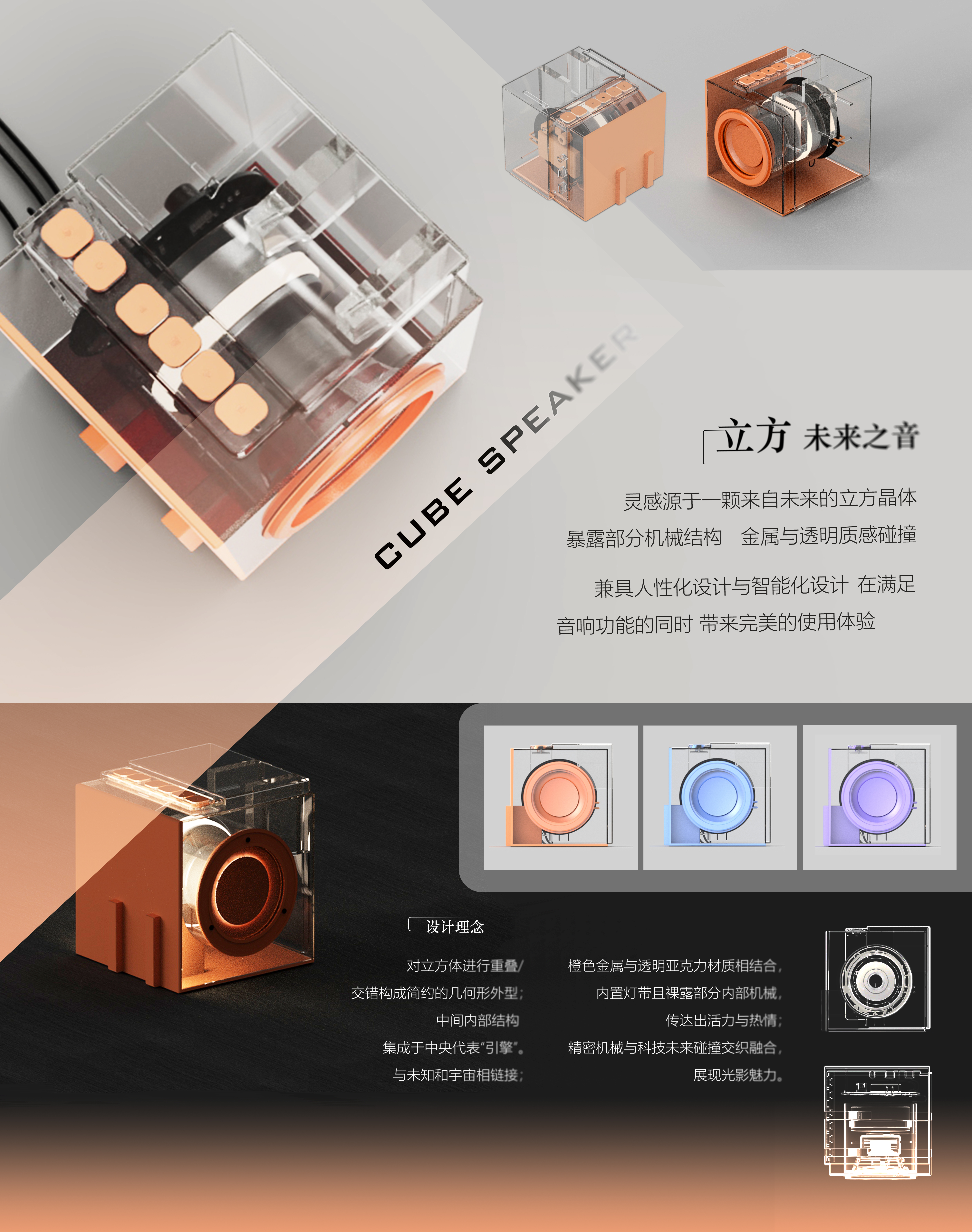 灵感源于一颗来自未来的立方晶体,对立方体进行重叠交错构成简约几何外形,暴露部分机械结构,体现“高技术风格”。中间内部结构集成于中央代表“引擎”,与未知和宇宙相链接。其拥有智能语音、灯光交互等功能,兼具人性化设计与智能化设计,在满足音响功能的同时,带来完美的使用体验。