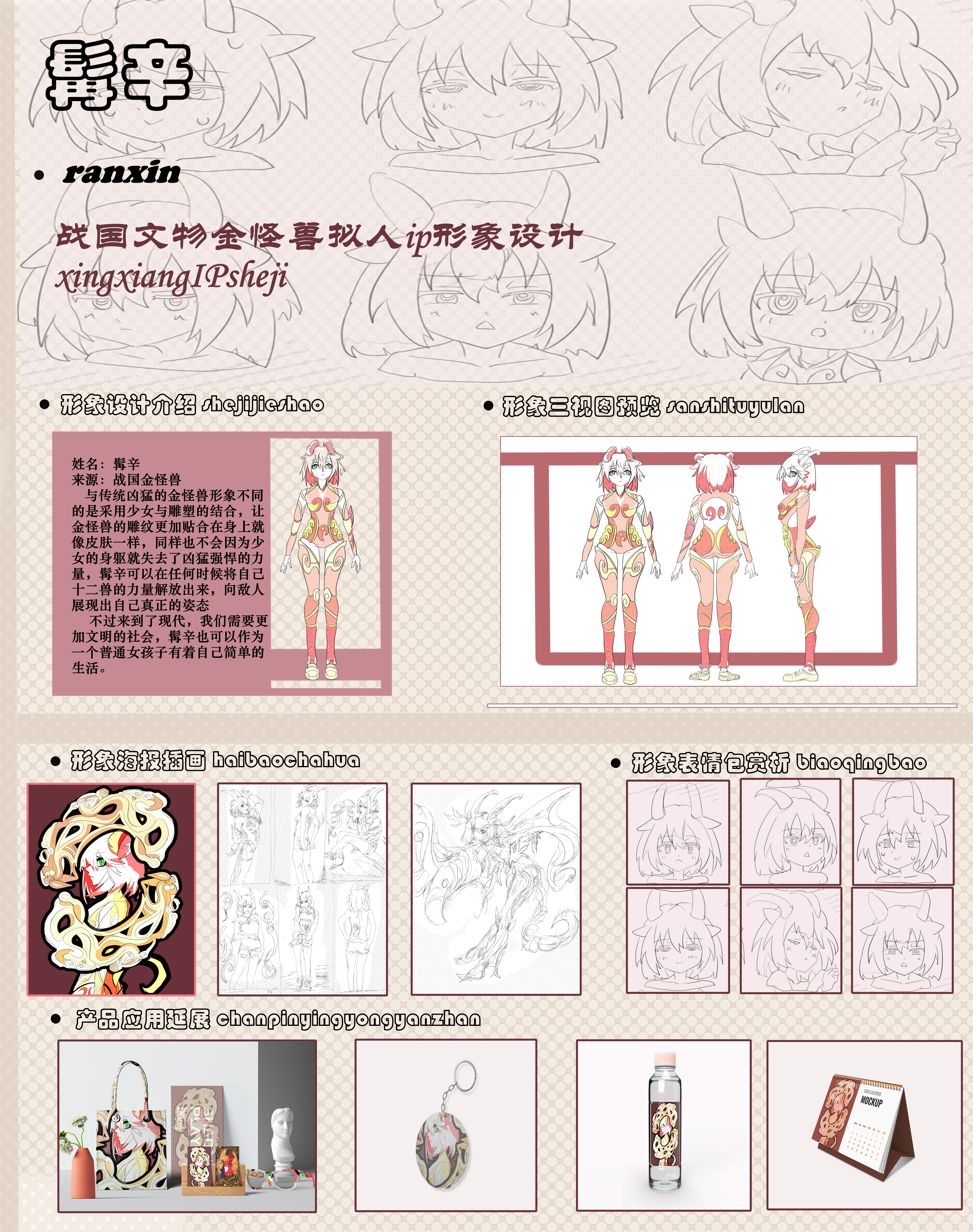 金怪兽作为一个战国时代的雕塑作品,我十分喜欢其中多种兽形结合在一起以及身体部位的花纹和大角鹿角的形状,我将金怪兽与当下的动漫二次元相结合,符合我的专业与兴趣,设计出髯辛这个虚拟角色,意为鬓发如云的八荒之主。但在现代环境的背景下不提倡武力,髯辛也可以作为一个可爱的二次元女孩子形象来展示自己,让更多的年轻人去发掘古代战国雕塑的文化和历史