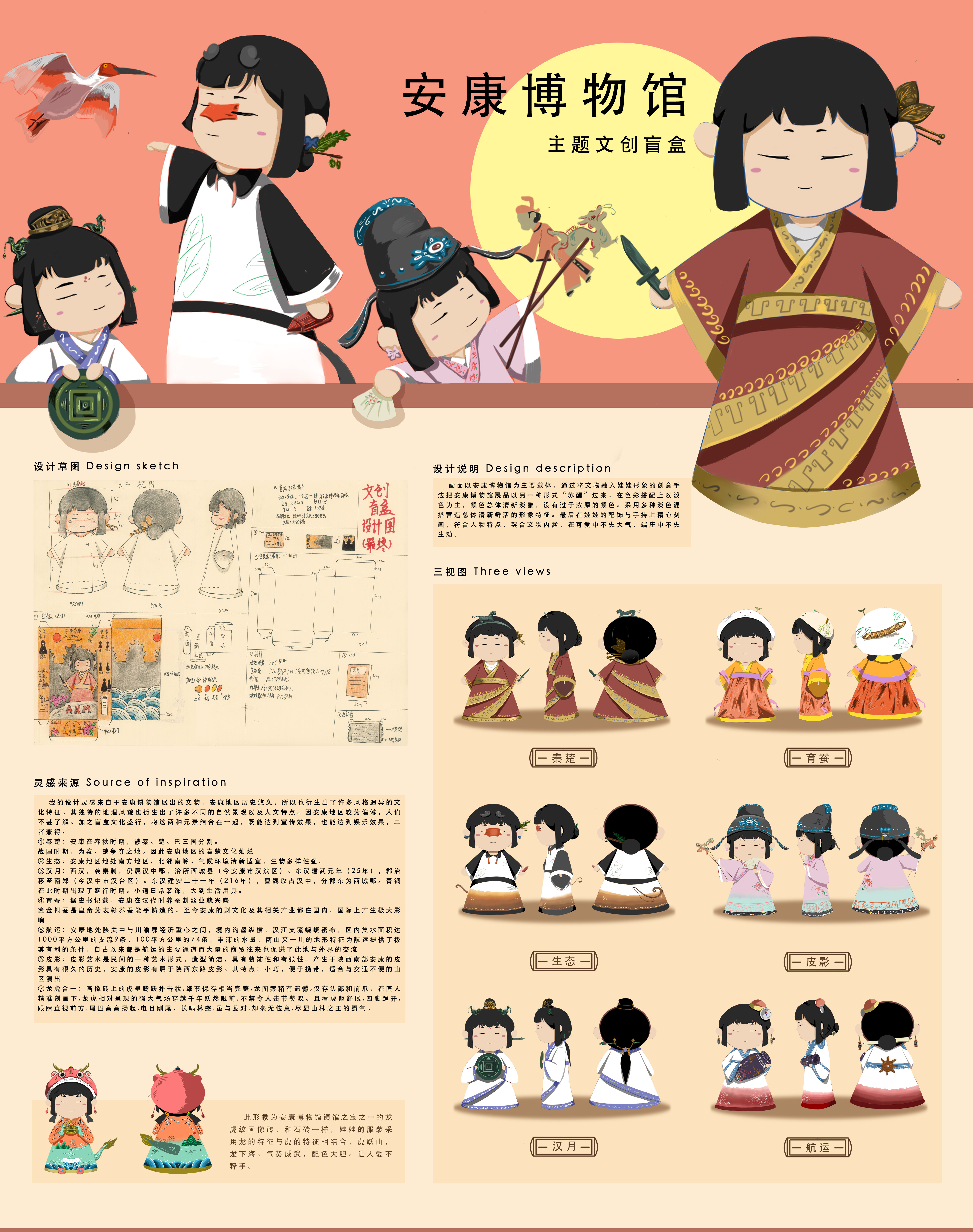 画面以安康博物馆为主要载体,通过融入文物元素至娃娃的服饰,配饰中,让文物更好的活过来。色彩以较为清新淡雅的色号配合,自然生动。为了让人们更好的了解安康,也更好的宣传安康,文物元素与娃娃特点相符,文物内涵,特征也致力展现。这样的两种元素融合,可爱中不失大气,端庄中不失生动。让人喜爱,也有教育学习功能,意义重大。