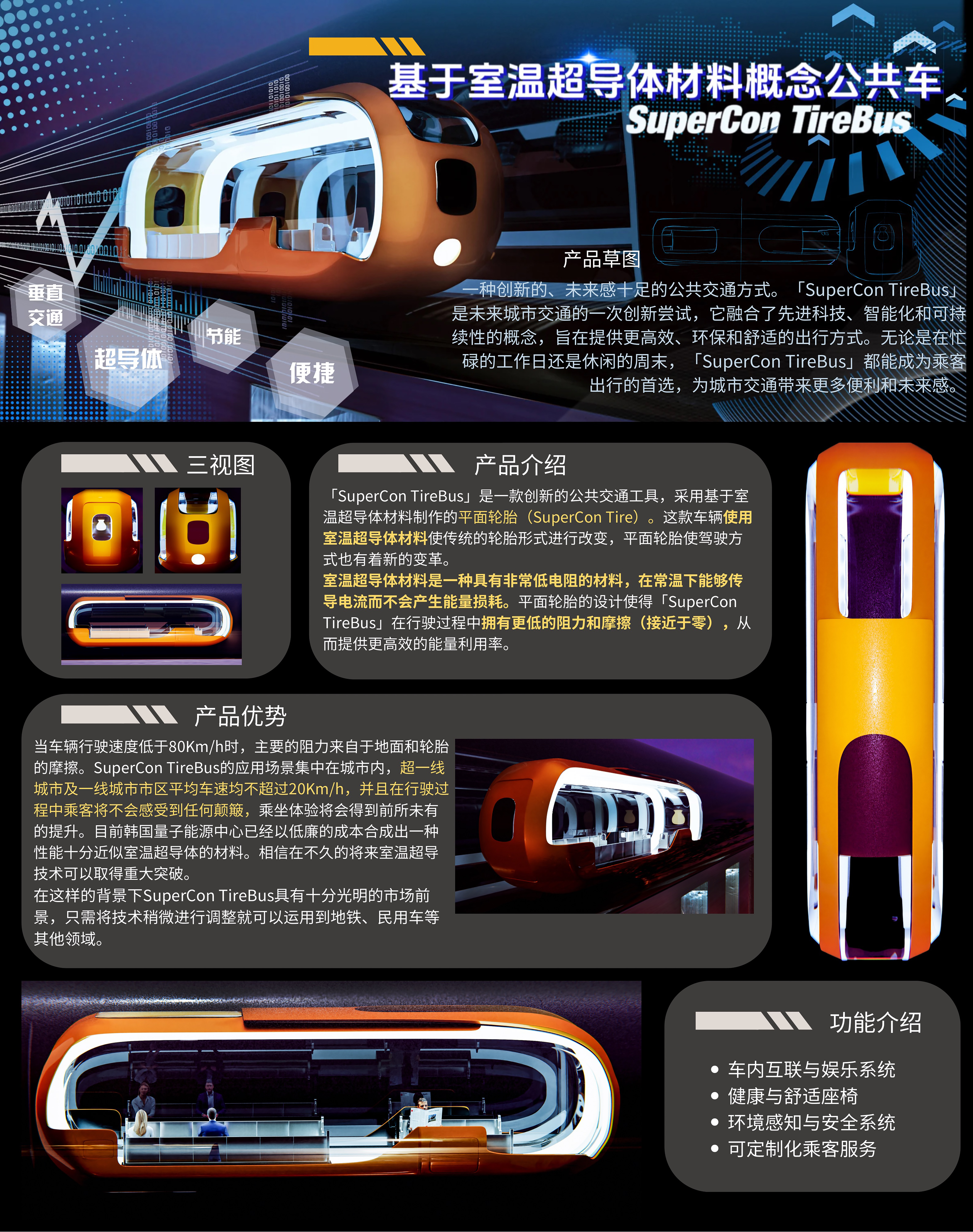 「SuperCon TireBus」是一款创新的公共交通工具,采用基于室温超导体材料制作的平面轮胎(SuperCon Tire)。这款车辆使用室温超导体材料使传统的轮胎形式进行改变,平面轮胎使驾驶方式也有着新的变革。室温超导体材料是一种具有非常低电阻的材料,在常温下能够传导电流而不会产生能量损耗。平面轮胎的设计使得其在行驶过程中拥有更低的阻力和摩擦(接近于零),从而提供更高效的能量利用率。