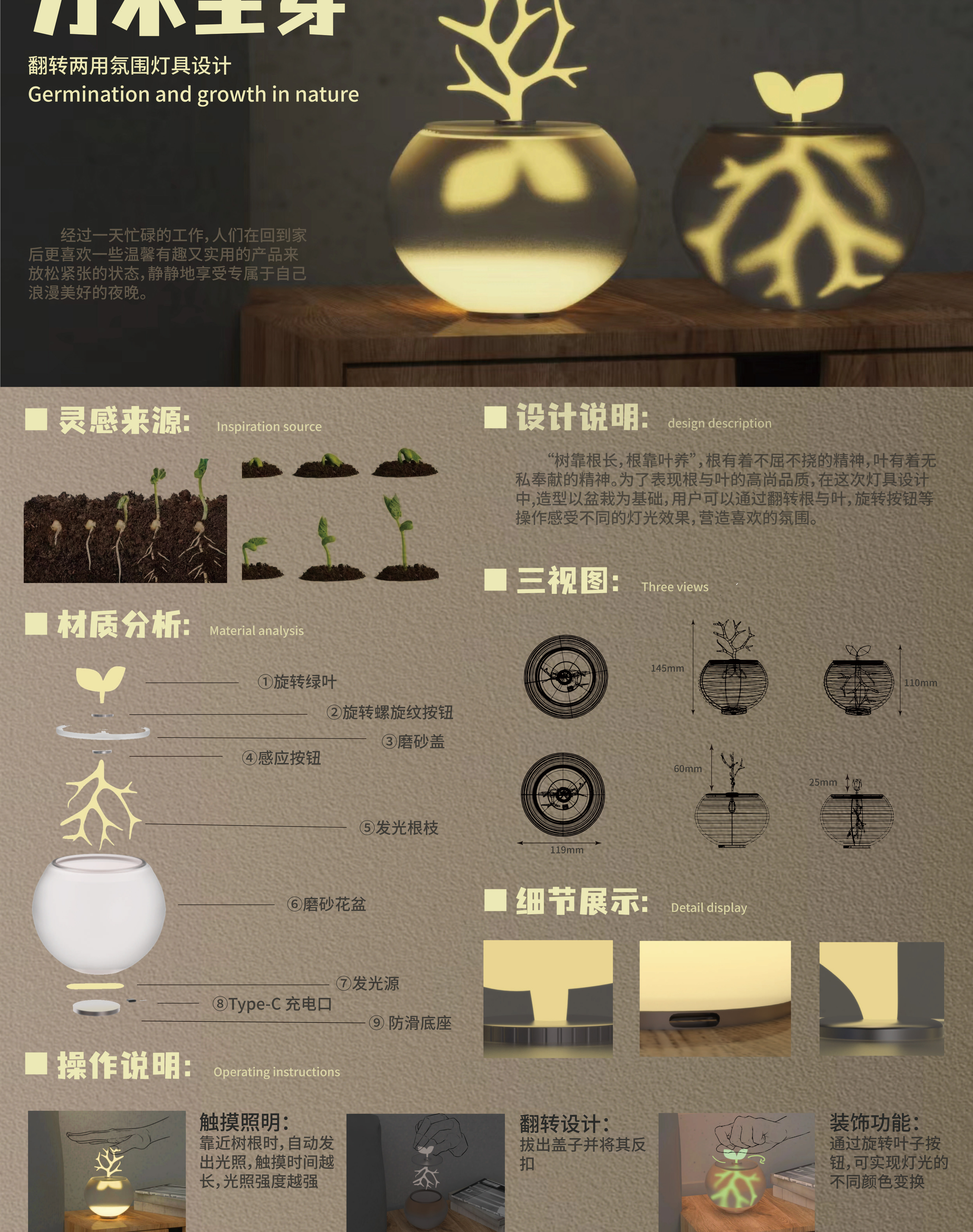 “树靠根长,根靠叶养”,根有着不屈不挠的精神,叶有着无私奉献的精神。为了表现根与叶的高尚品质,在这次灯具设计中,造型以盆栽为基础,用户可以通过翻转根与叶,旋转按钮等操作感受不同的灯光效果,营造喜欢的氛围。