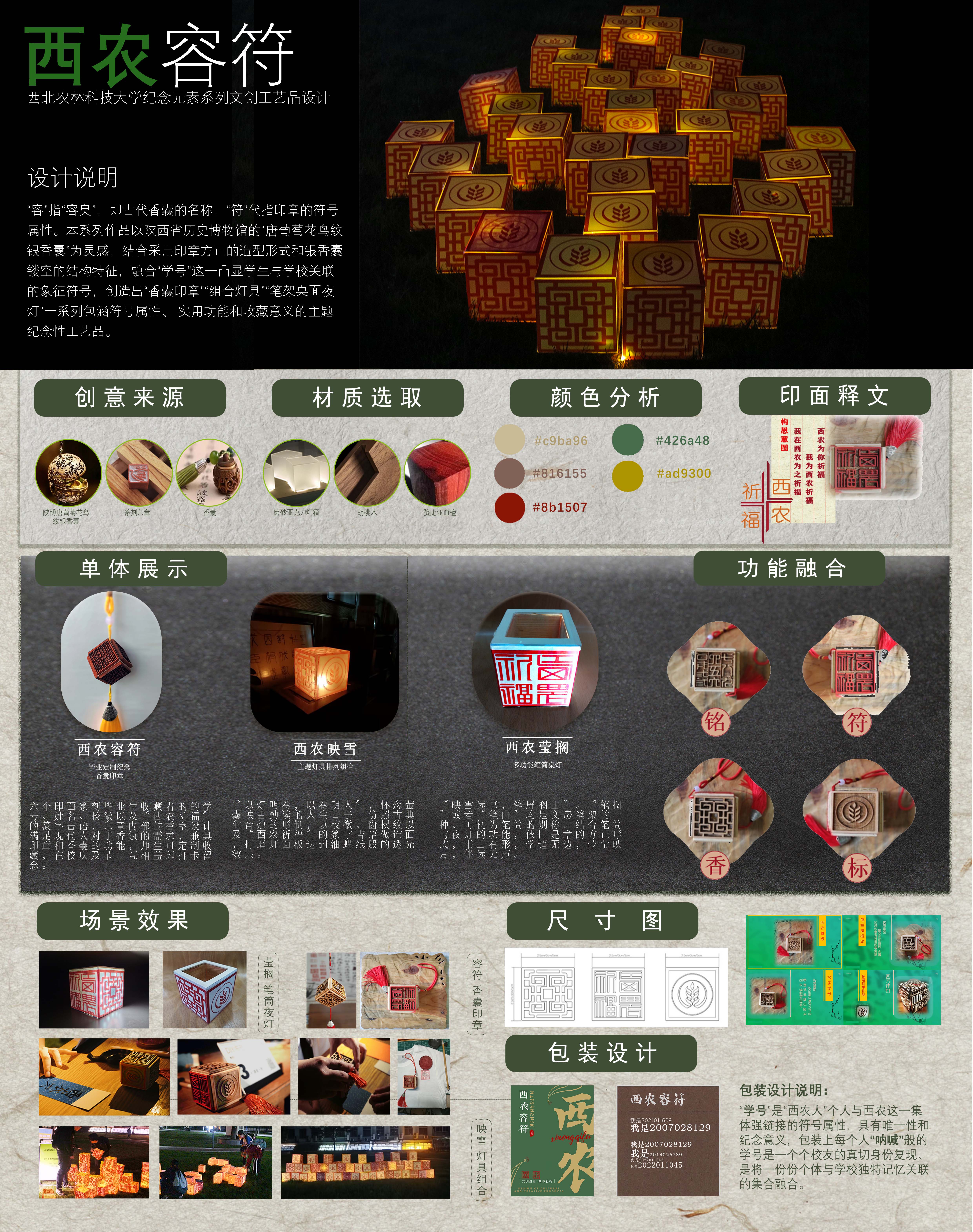 “容”指“容臭”,即古代香囊的名称,“符”代指印章的符号属性。本系列作品以陕西省历史博物馆的“唐葡萄花鸟纹银香囊”为灵感,结合采用印章方正的造型形式和银香囊镂空的结构特征,融合“学号”这一凸显学生与学校关联的象征符号,创造出包涵符号属性、 实用功能和收藏意义的系列主题纪念性工艺品。