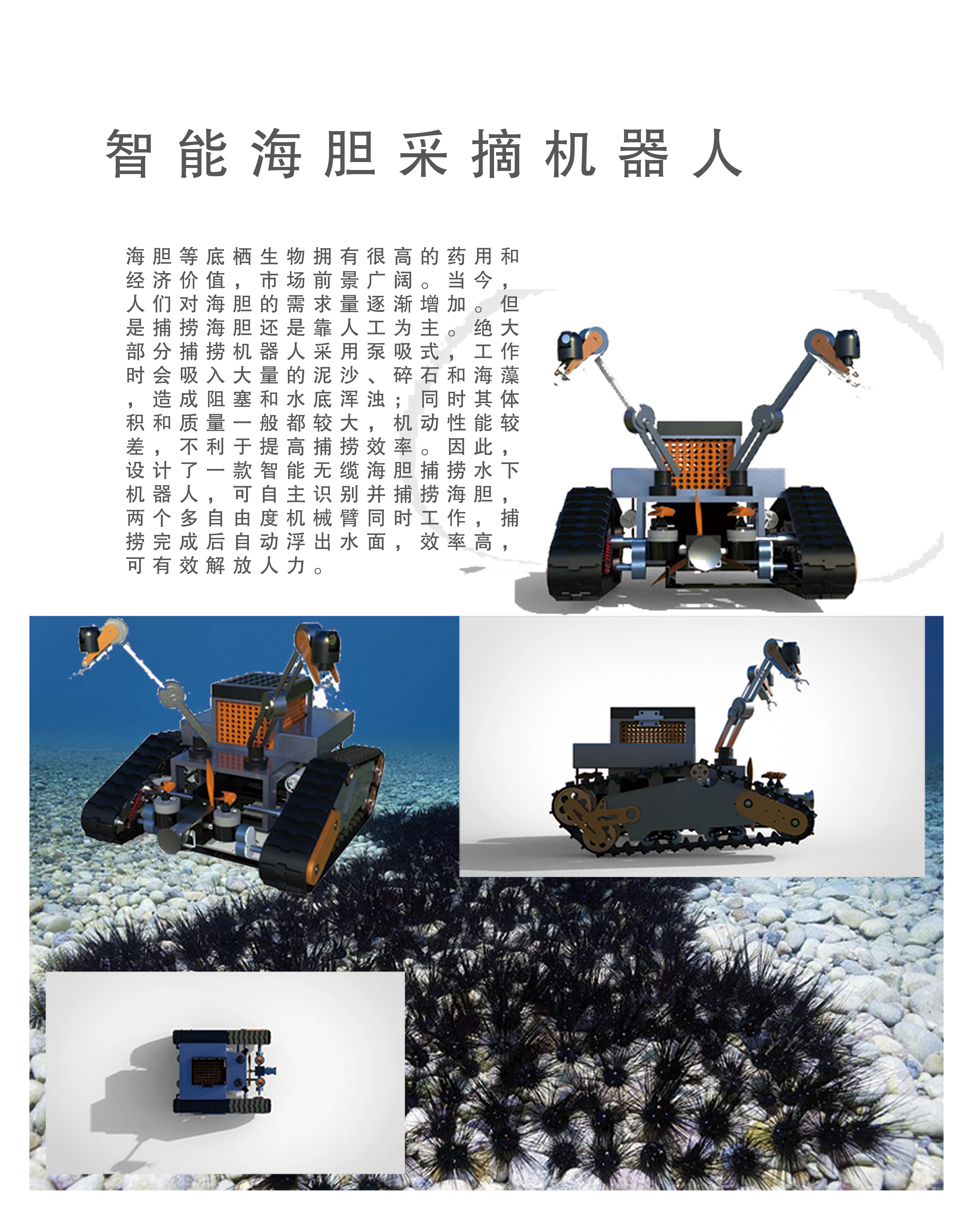 本产品名称为智能无缆海胆捕捞水下机器人,可自主识别并捕捞海胆,两个多自由度机械臂同时工作,捕捞完成后自动浮出水面,效率高,可有效解放人力。