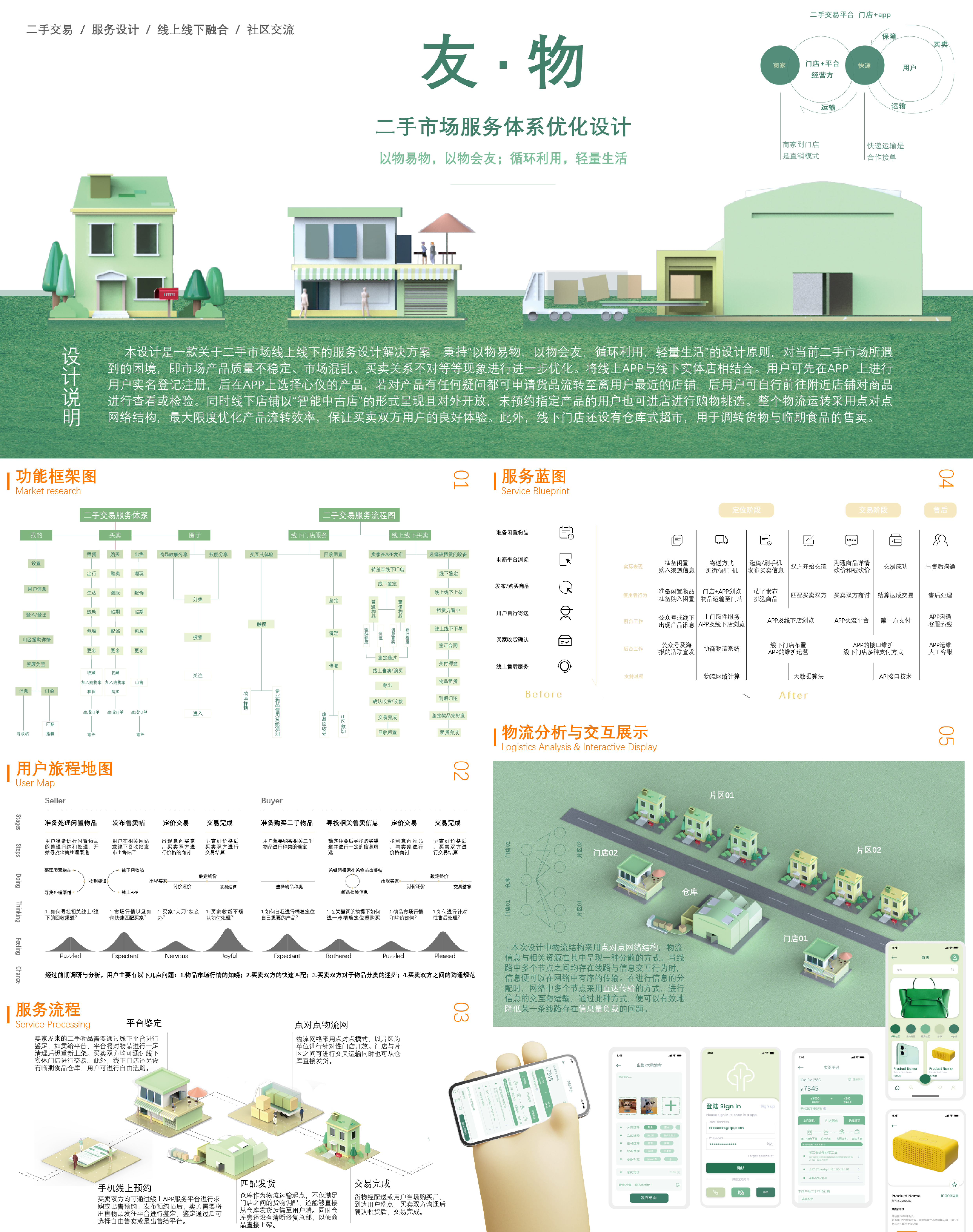 本设计是一款关于二手市场服务设计解决方案,对当前二手市场乱象,产品质量不稳定、买卖关系不对等等现象进一步优化。将线上APP与线下实体店相结合。用户可先在APP 上实名登记注册,后在APP上选择心仪的产品,后用户可自行前往附近店铺对商品进行查看。同时线下店铺以“智能中古店”的形式对外开放,未预约指定产品的用户也可进店进行购物挑选。此外,线下门店还设有仓库式超市,用于临期食品的售卖。