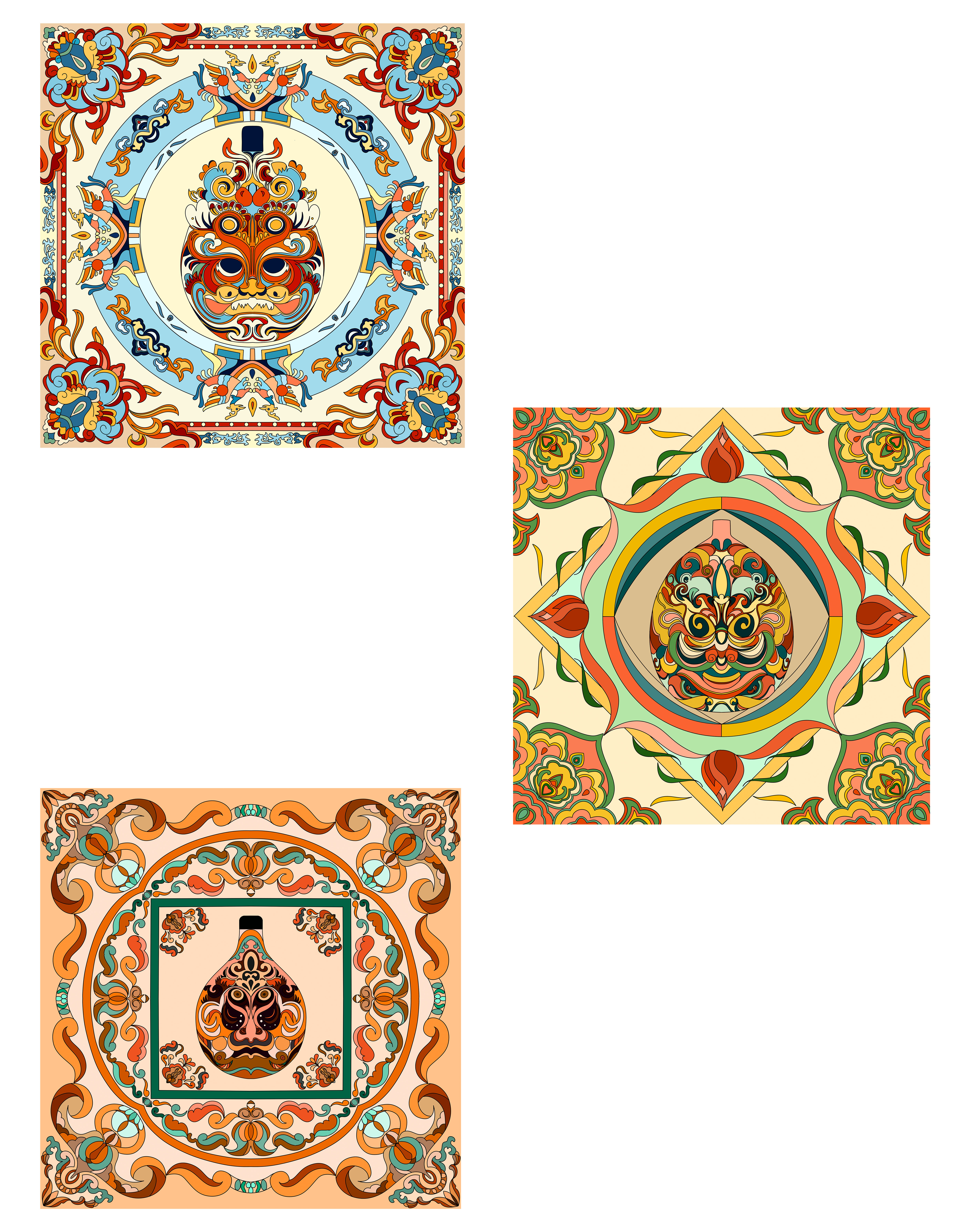 此作品以 陕西马勺脸谱中的人物角色为主题,从人物脸谱的性格出发,对对主体进行拆分,重组,提取并且进行创意设计。主体的周围运用了中国传统纹样设计,并且以主体为中心,主次分明,层次分明,色彩上运用了轻微的冷暖色对比,效果分明,符合现代人的审美倾向。整幅作品不仅保留了传统文化的精华,更是将创新精神得以体现,并且顺应了时代发展之趋势。